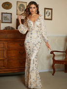 Lantern Sleeve V-Neck Sequin Grey Evening Gown XJ1505