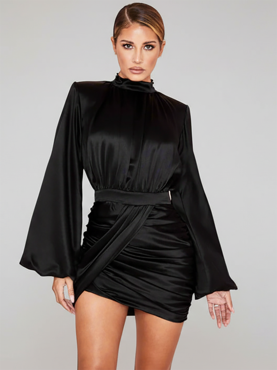 Stand Collar Ruched Ballon Sleeve Mini Dress MCW1200