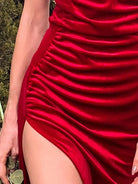 This Split Ruched Red Velvet Cami Prom Dress features a bodycon silhouette and a sleeveless design, crafted with velvet for a chic, eye-catching look.