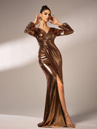 Wrap Long Sleeve Metallic Prom Dress RJ12035