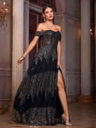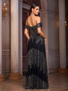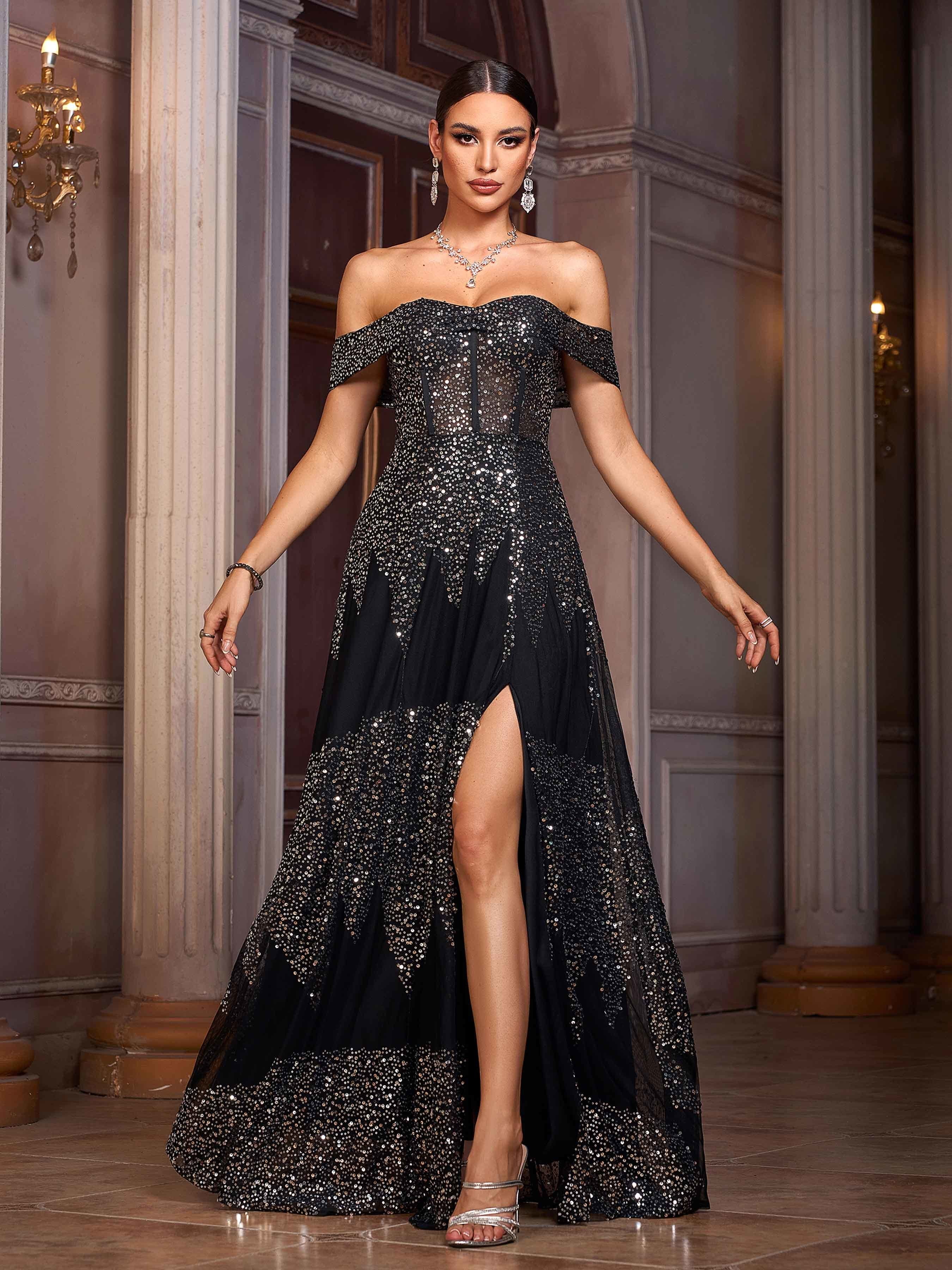 Black Off Shoulder Sequin A-line Prom Dress RX70435