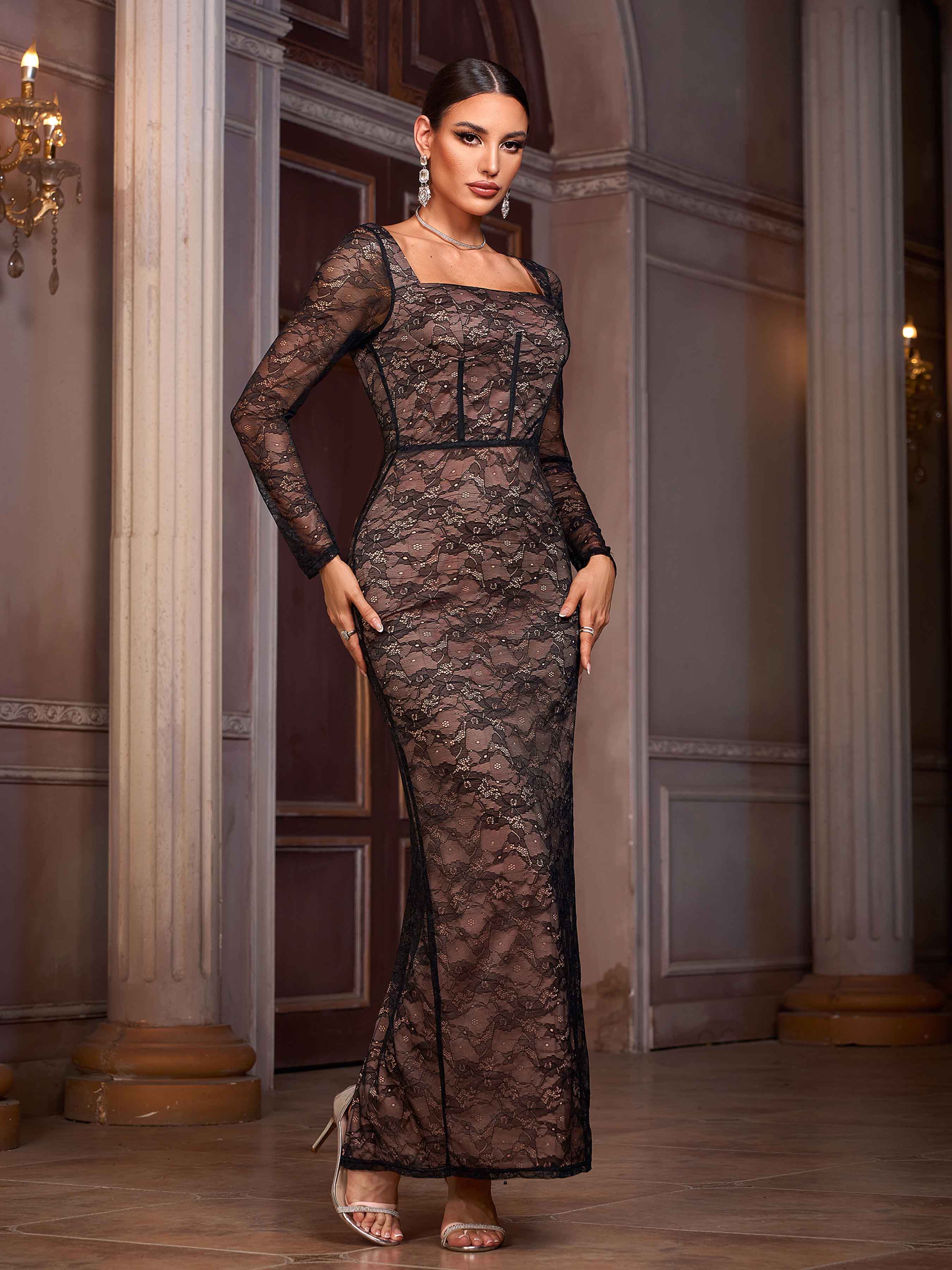 Square Neck Long Sleeve Lace Slit Formal Dress GM00835