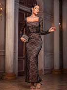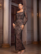 Step into elegance with this Square Neck Long Sleeve Lace Slit Formal Dress. Its delicate lace and daring slit add a flirtatious twist to classic sophistication, while the square neckline and long sleeves keep it chic and polished. Perfect for occasions where you want to charm and captivate with every step.