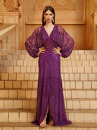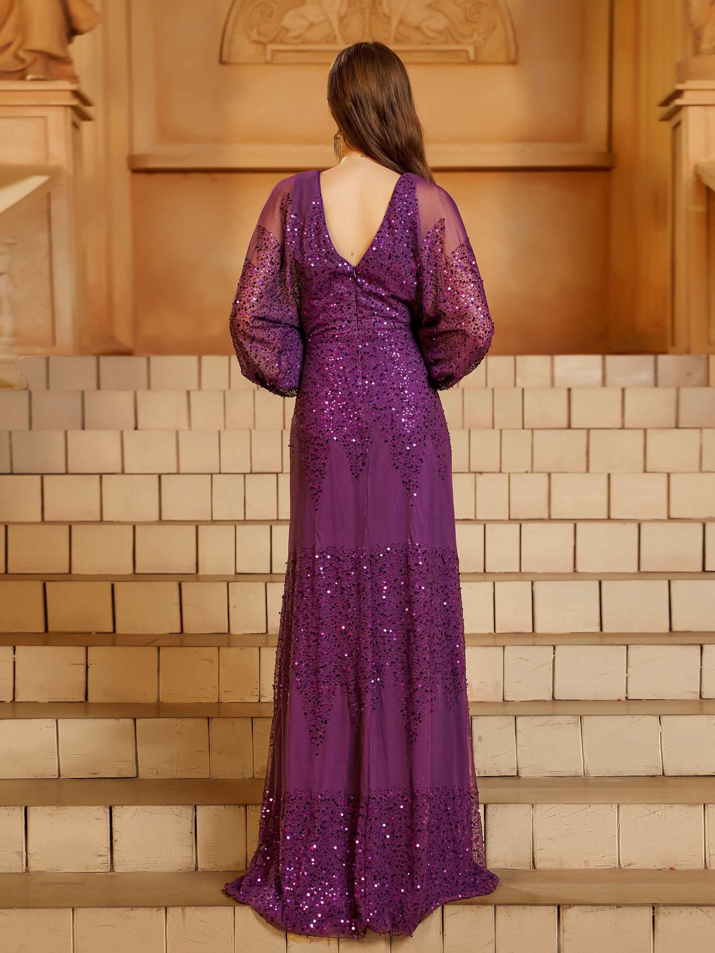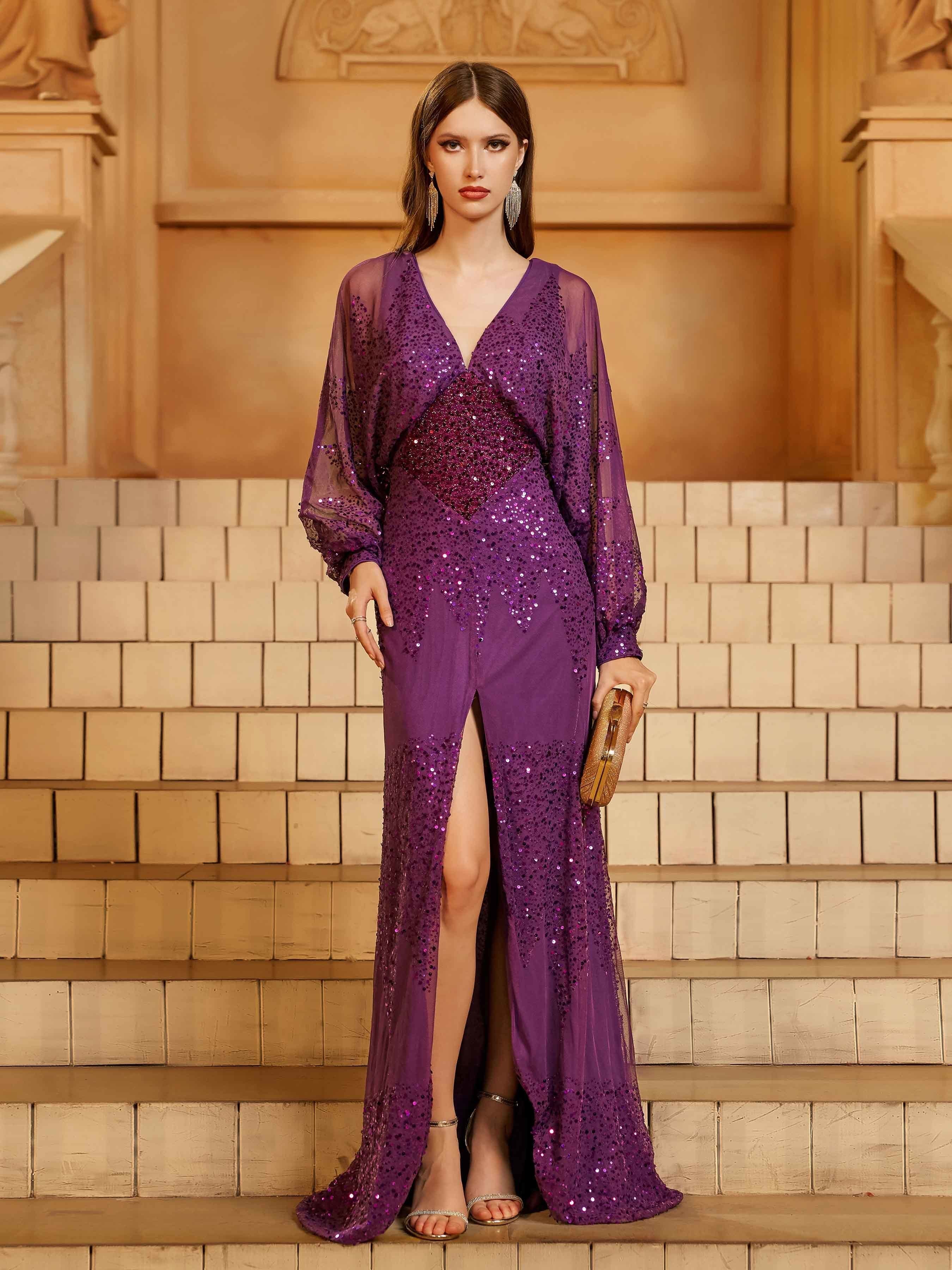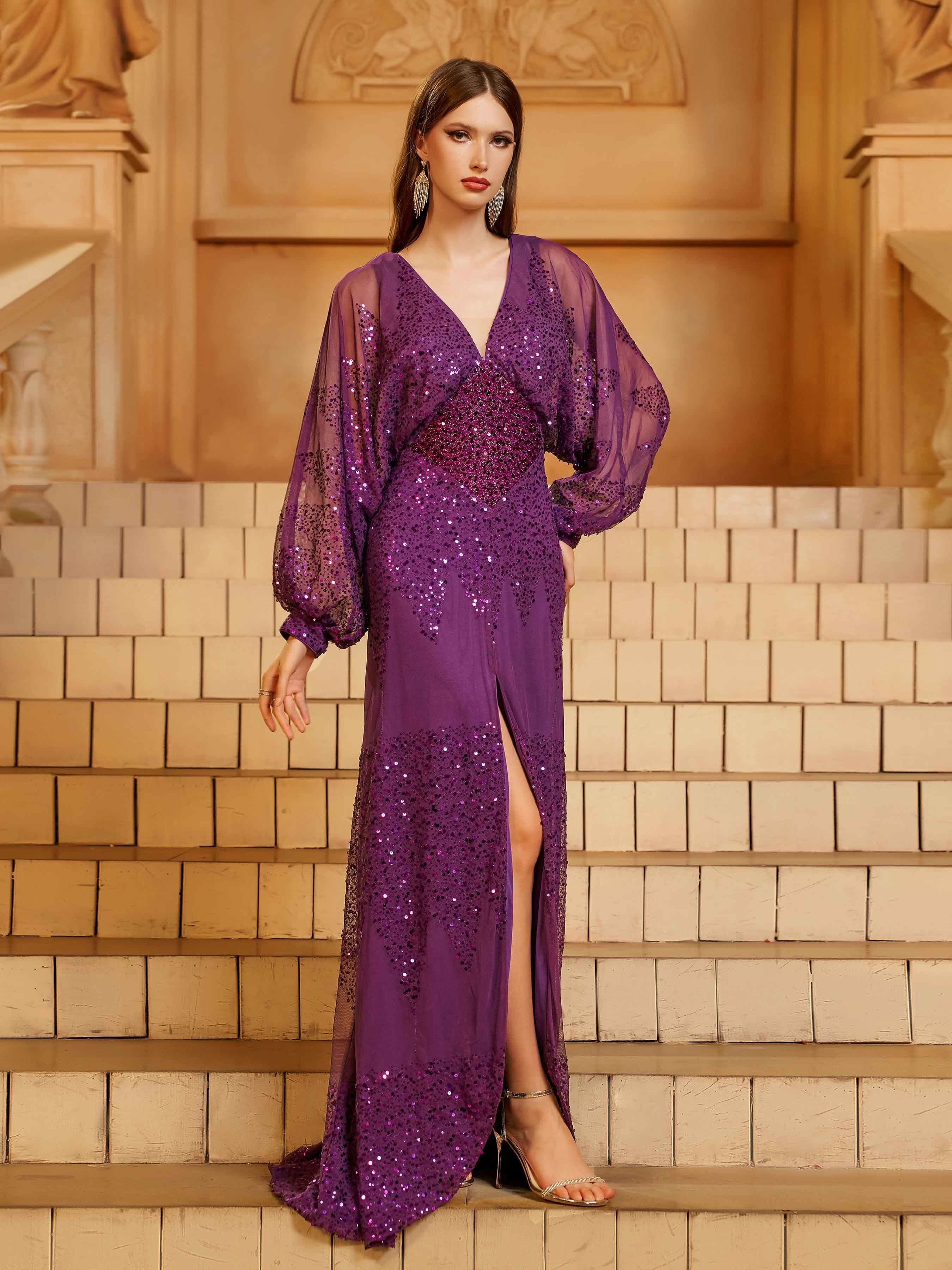 Dazzle in this Lantern Sleeve V-Neck High Split Prom Dress! With its elegant lantern sleeves and alluring high split, you'll turn heads all night long. The V-neckline adds a touch of sophistication while the sleek black color is both timeless and versatile. Elevate your prom experience with this stunning dress.