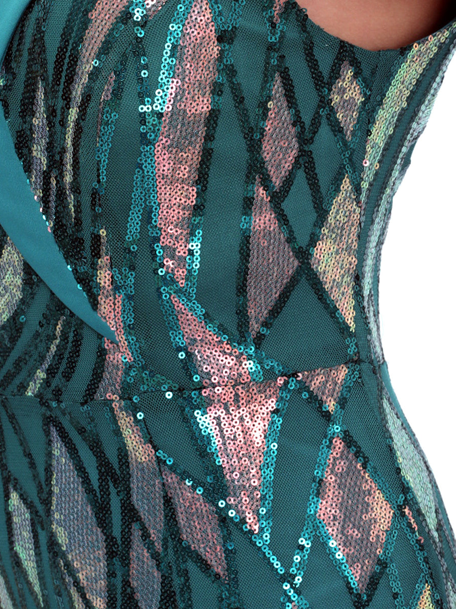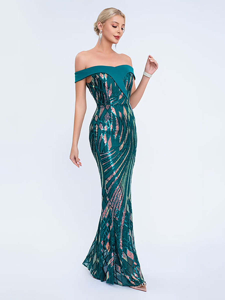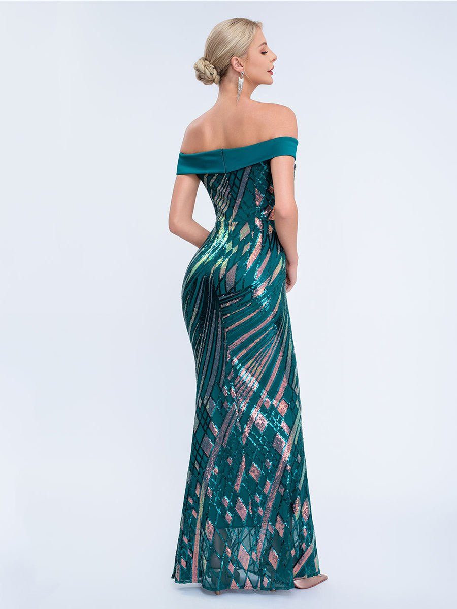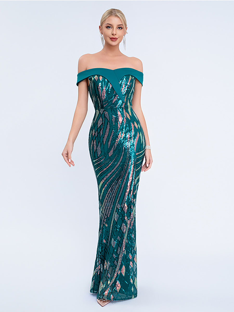 Designed for eye-catching formal events, this teal gown features all-over iridescent sequin patterns (with pink/gold undertones), an off-shoulder sweetheart neckline, and a sleek mermaid silhouette for bold, shimmering glamour. Perfect for galas, red-carpet occasions, and festive evening celebrations.