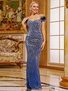 Off épaule paillettes bleu Maxi robe de soirée RH30185