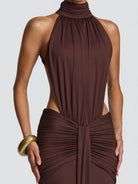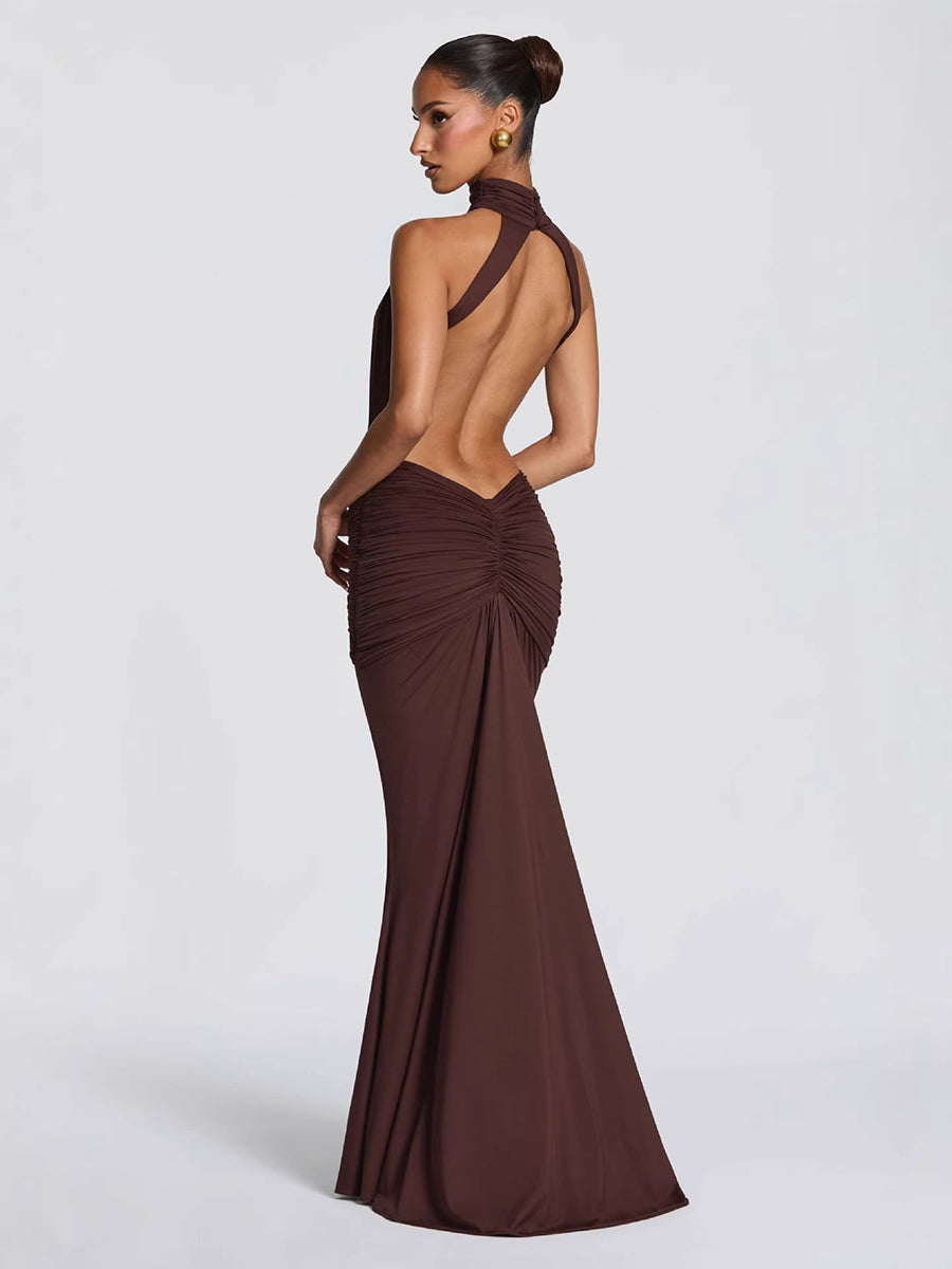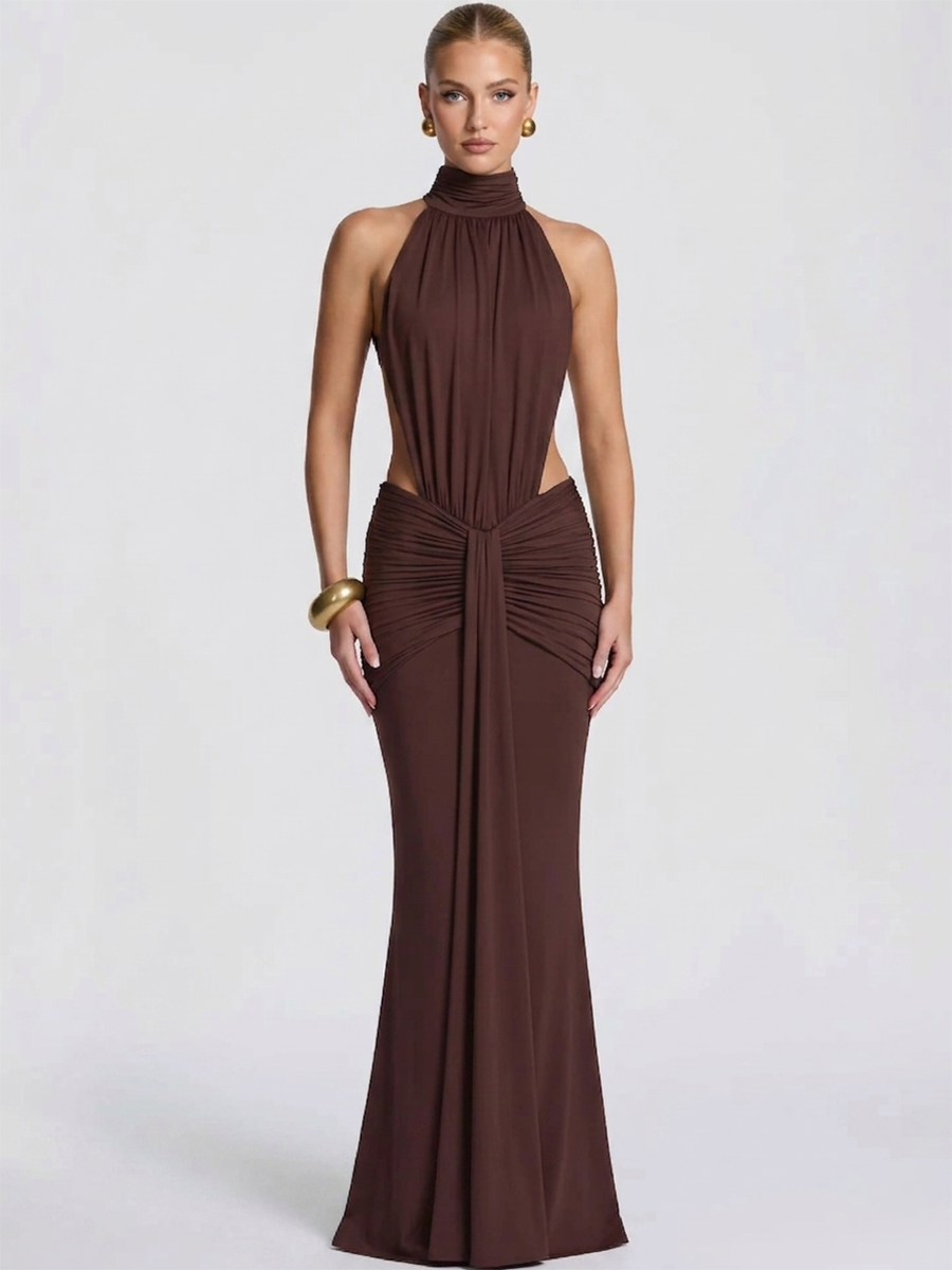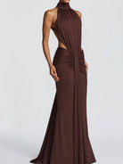 Make a bold statement at your next formal event with this stunning brown maxi gown. It features a high ruched halter neckline, dramatic side cutouts, an open back, and a gathered waist detail that flows into a sleek mermaid silhouette. The stretchy fabric hugs every curve, creating a sultry yet elegant look perfect for galas, prom, and black-tie celebrations.