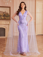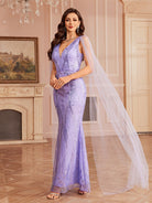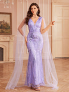Designed for dreamy formal events, this lavender gown features intricate silver sequin patterns, a deep V-neck, body-hugging mermaid silhouette, and a flowing sheer tulle cape for soft glamour. Perfect for weddings, galas, and romantic evening occasions.