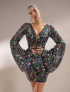 Get ready to turn heads in this playful and flirty V-Neck Flared Sleeve Multicolor Sequin Mini Dress! With its long bell sleeves and deep V-neck, this bodycon mini party dress is both stylish and fun. The multicolor printed design adds a touch of whimsy and is sure to make you stand out at any event.