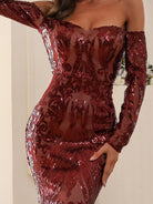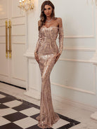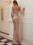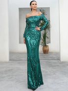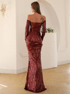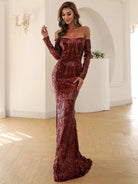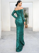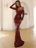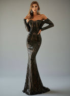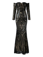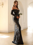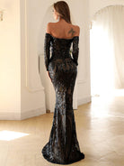 This is an elegant black off-shoulder mermaid dress designed with sequins for special occasions. Its form-fitting silhouette is crafted with exquisite craftsmanship, providing a captivating fit and lasting comfort. Make a sophisticated statement in this timeless dress.