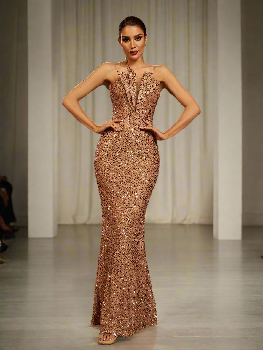 Let all eyes on you with this stunning, strapless, sequin mermaid maxi dress. Perfect for prom, it'll have you looking elegant AF as you glide down the aisle. Folds and style give it a fashion-forward look that'll leave 'em speechless. Get ready to make a splash!