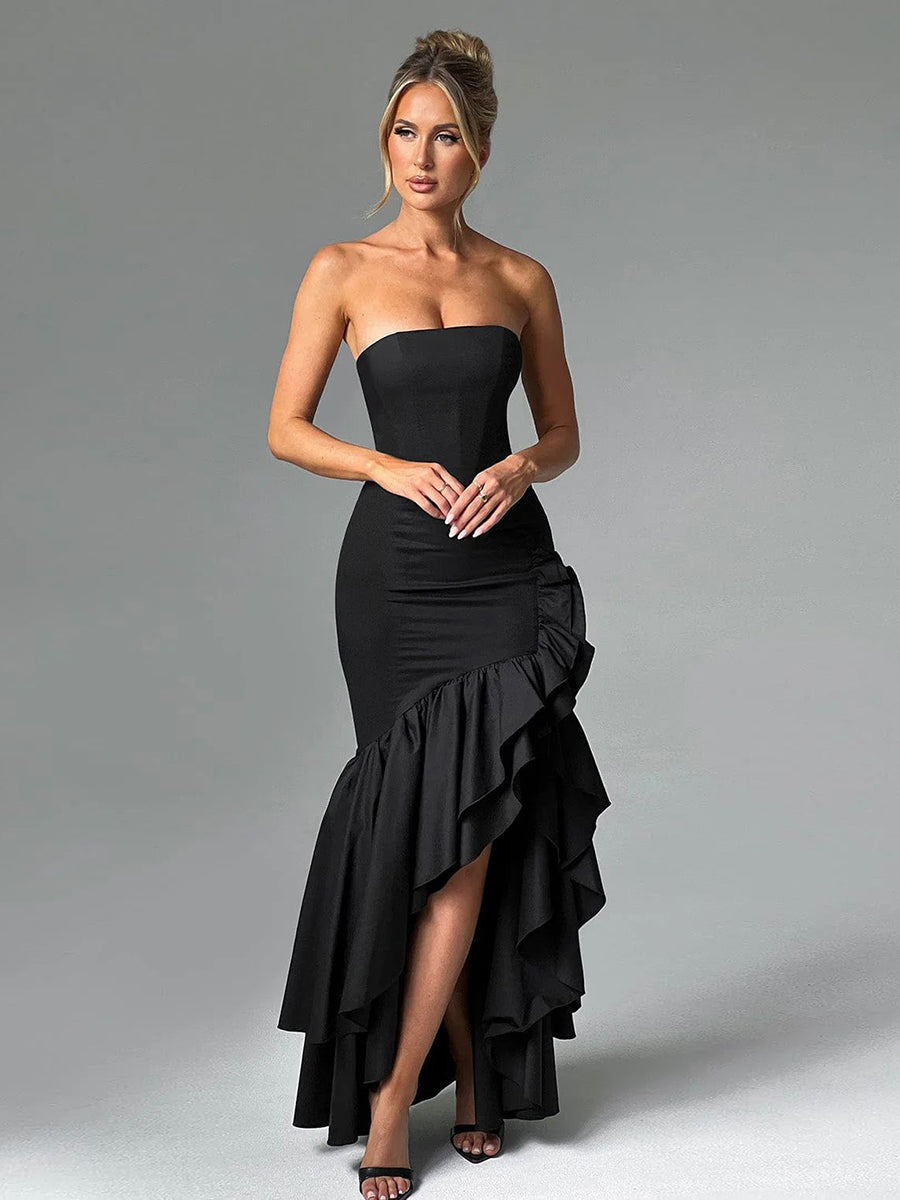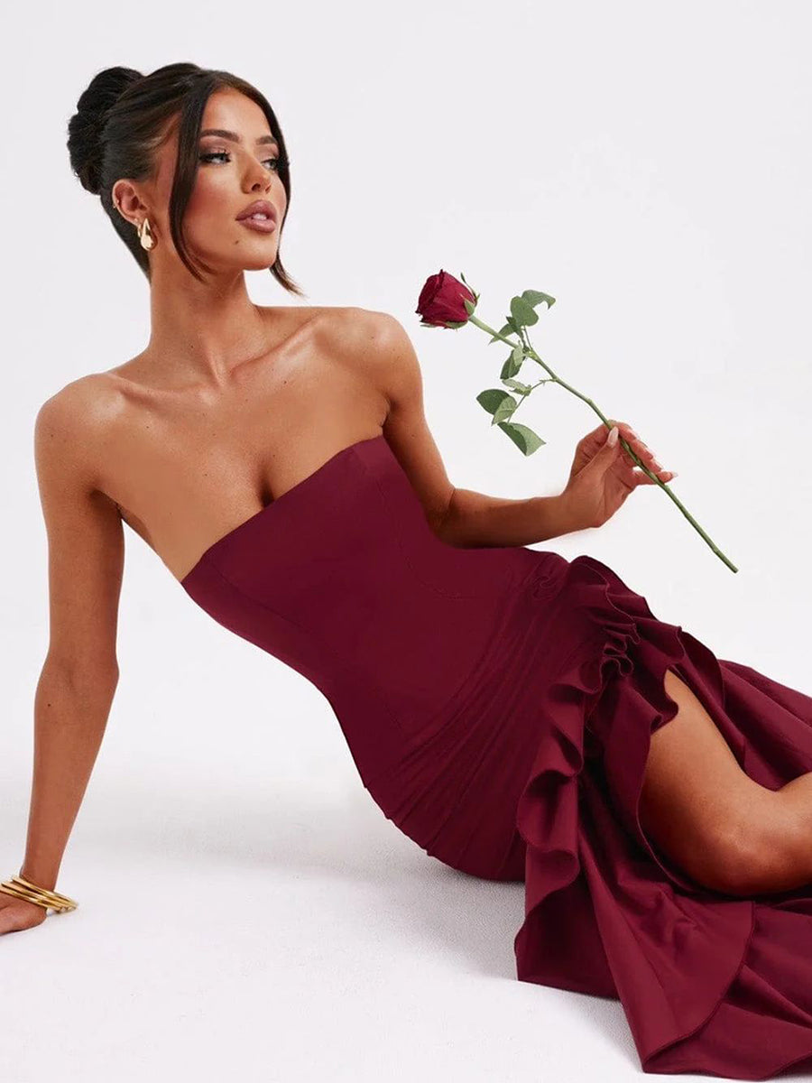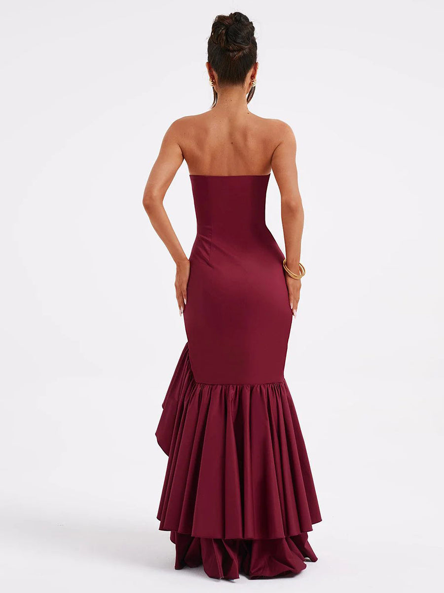 Wine Strapless Ruffled Asymmetrical Prom Dress XF05765