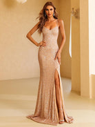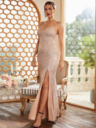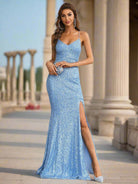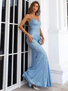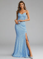 Dieses Maxi-Abschlussballkleid im Meerjungfrau-Stil ist ein atemberaubendes Abendkleid mit trendigem Stil. Es verfügt über einen Spaghettiträger, einen Schlitz über die gesamte Länge und ein Schnürdesign auf der Rückseite für einen sexy und eleganten Look. Verlassen Sie sich auf dieses Kleid für ein atemberaubendes Ensemble für den Abschlussball.