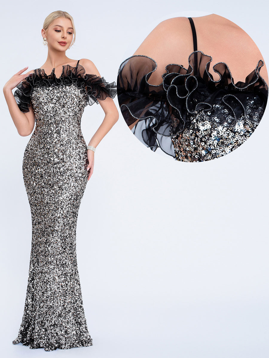 Designed for showstopping formal events, this gown features black-silver ombre sequin detailing, an off-shoulder neckline with crystal-trimmed tulle ruffle accents, and a sleek mermaid silhouette for bold, shimmering glamour. Perfect for galas, red-carpet occasions, and festive evening celebrations.
