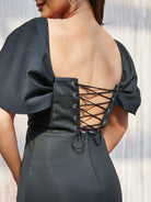 This exquisite evening dress features a figure-flattering mermaid silhouette made of fine knit fabric. It is designed with a lace-up back that draws attention to the waist, creating a look of sophistication and elegance.