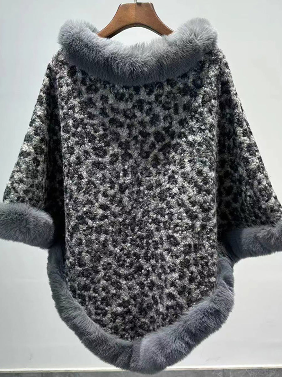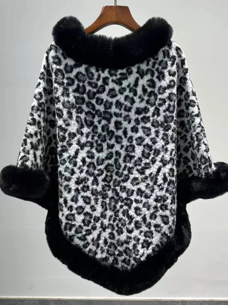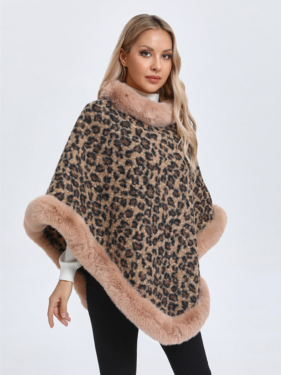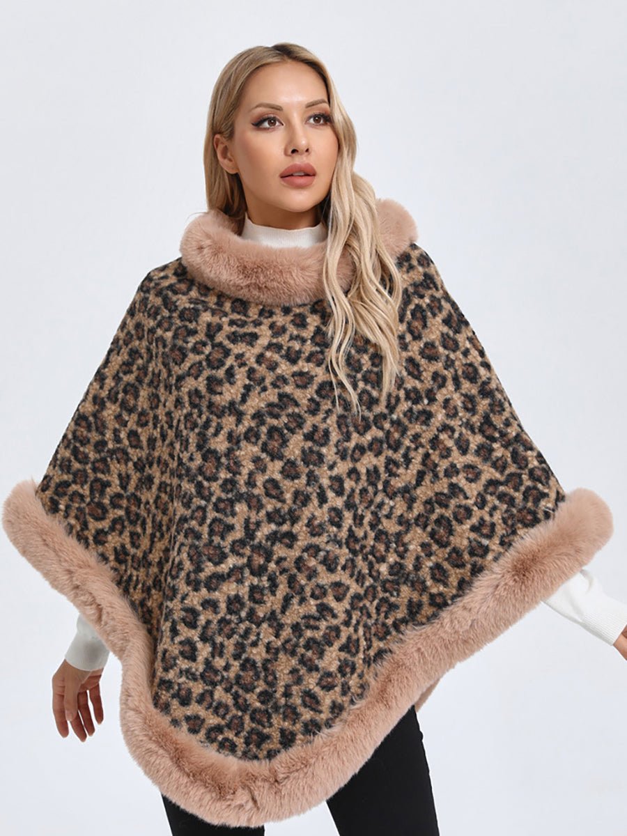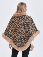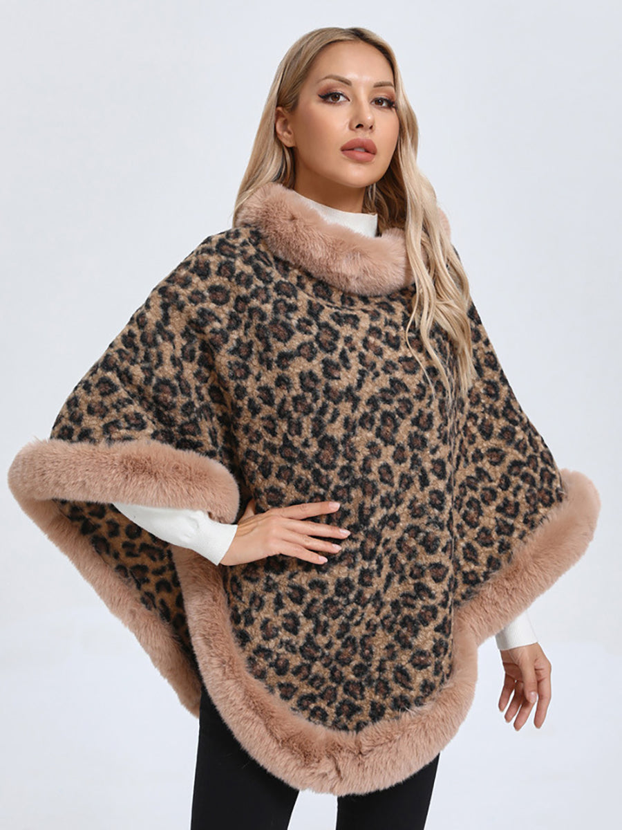 Leopard Print Faux Fur Trim Knitted Poncho Shawl MSF037