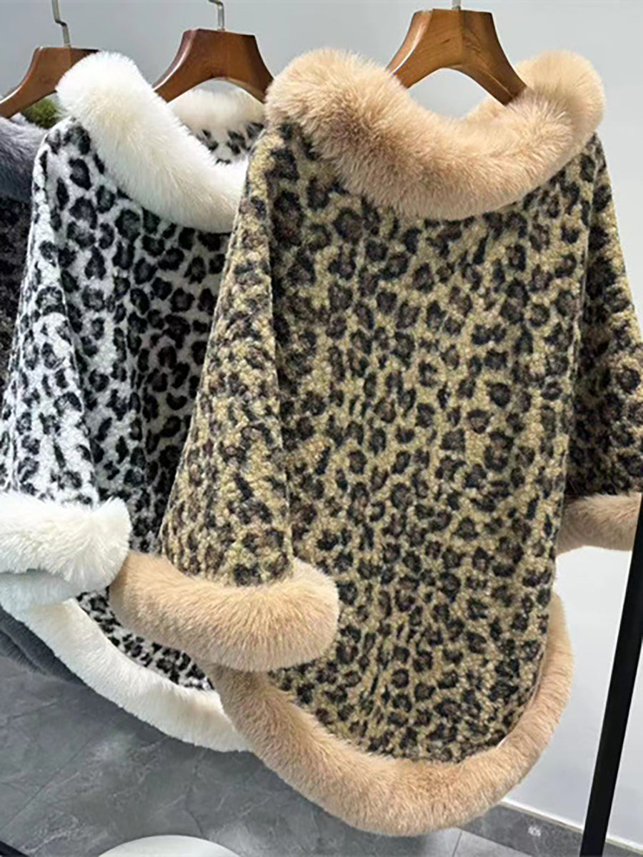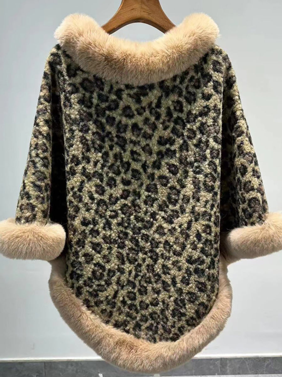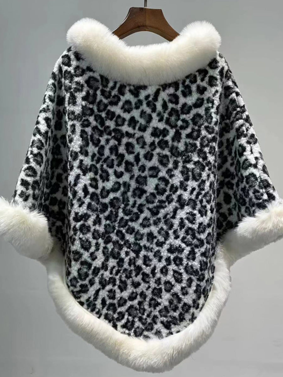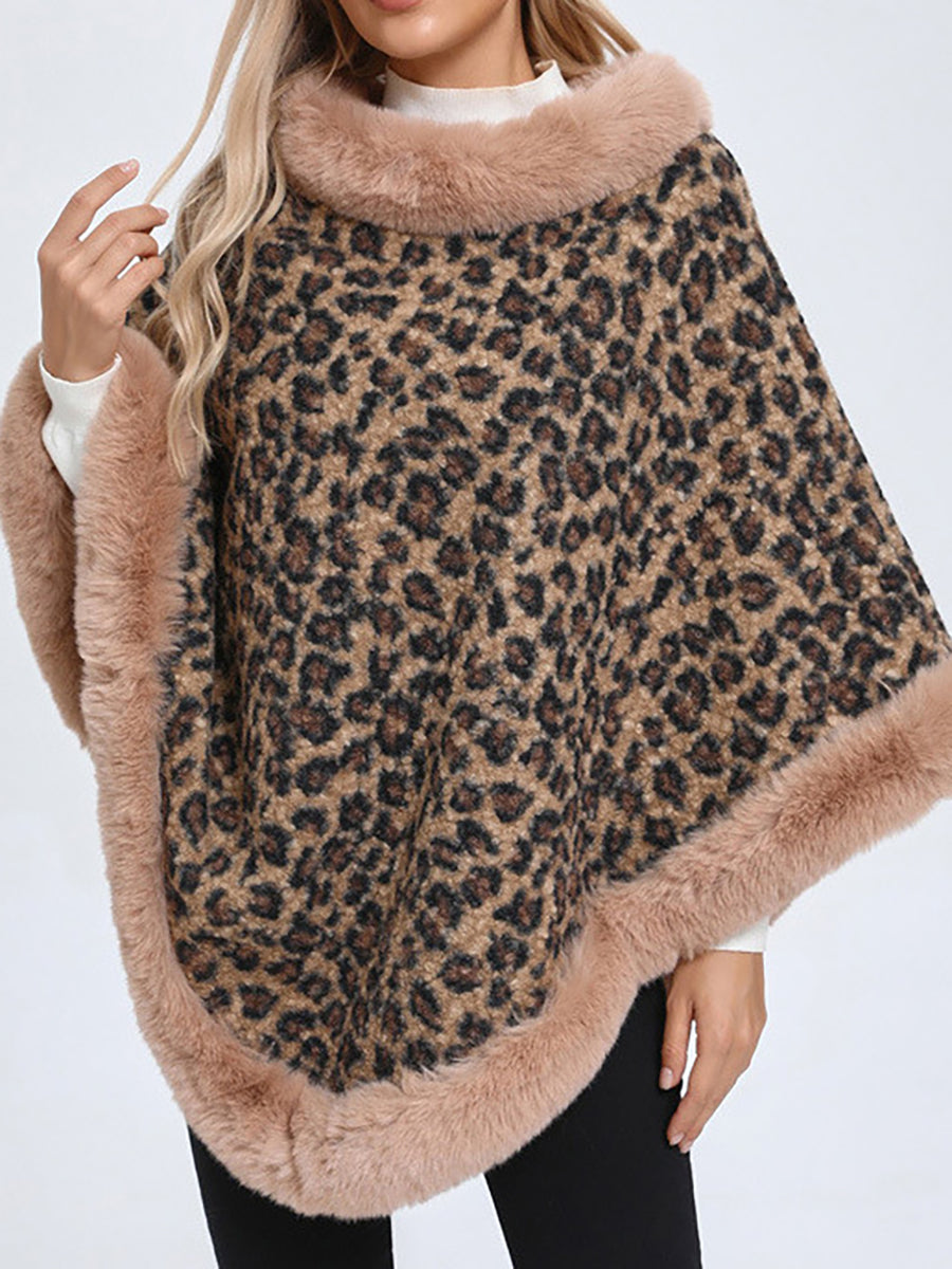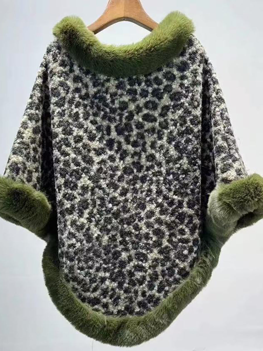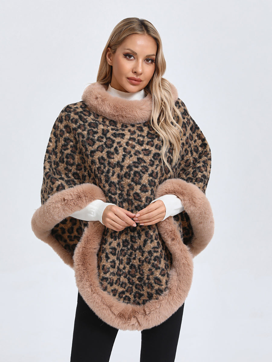 Leopard Print Faux Fur Trim Knitted Poncho Shawl MSF037