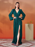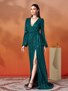 Indulge in elegance with our Sexy V-neck Slit Sequin Prom Dress. The plunging neckline and daring slit will captivate attention, while the shimmering sequins and maxi length add glamour and sophistication. Complete the look with lantern sleeves for a touch of drama. Elevate your style and enchant the crowd in this stunning dress!