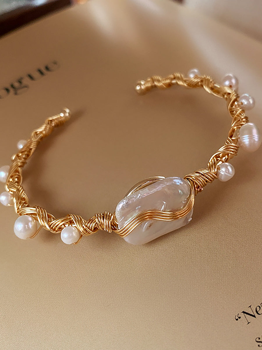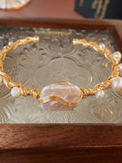 This delicate open-cuff bracelet showcases a luminous baroque pearl as its centerpiece, embraced by intricately woven gold-plated wire and accented with tiny freshwater pearls. It’s a blend of artisanal detail and timeless elegance, designed to add a refined glow to any occasion.
