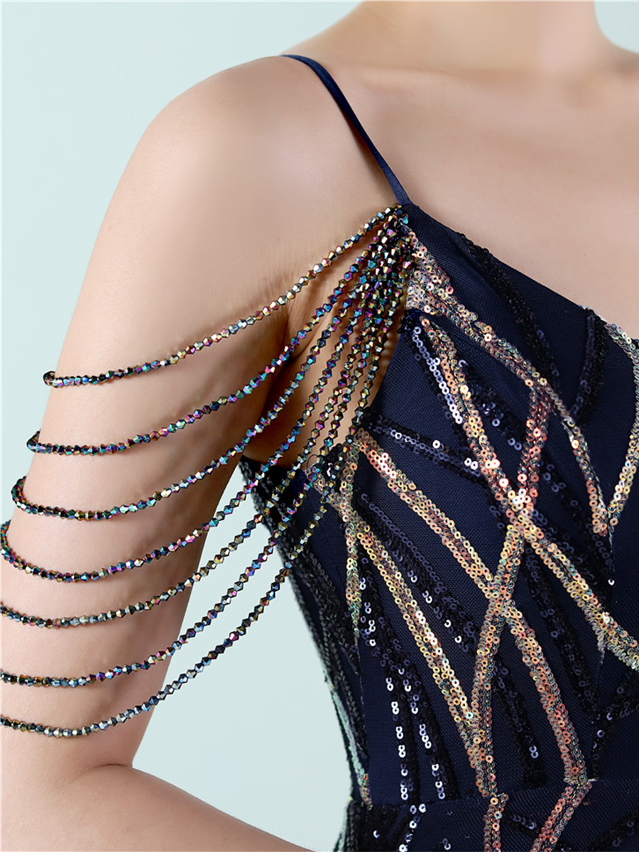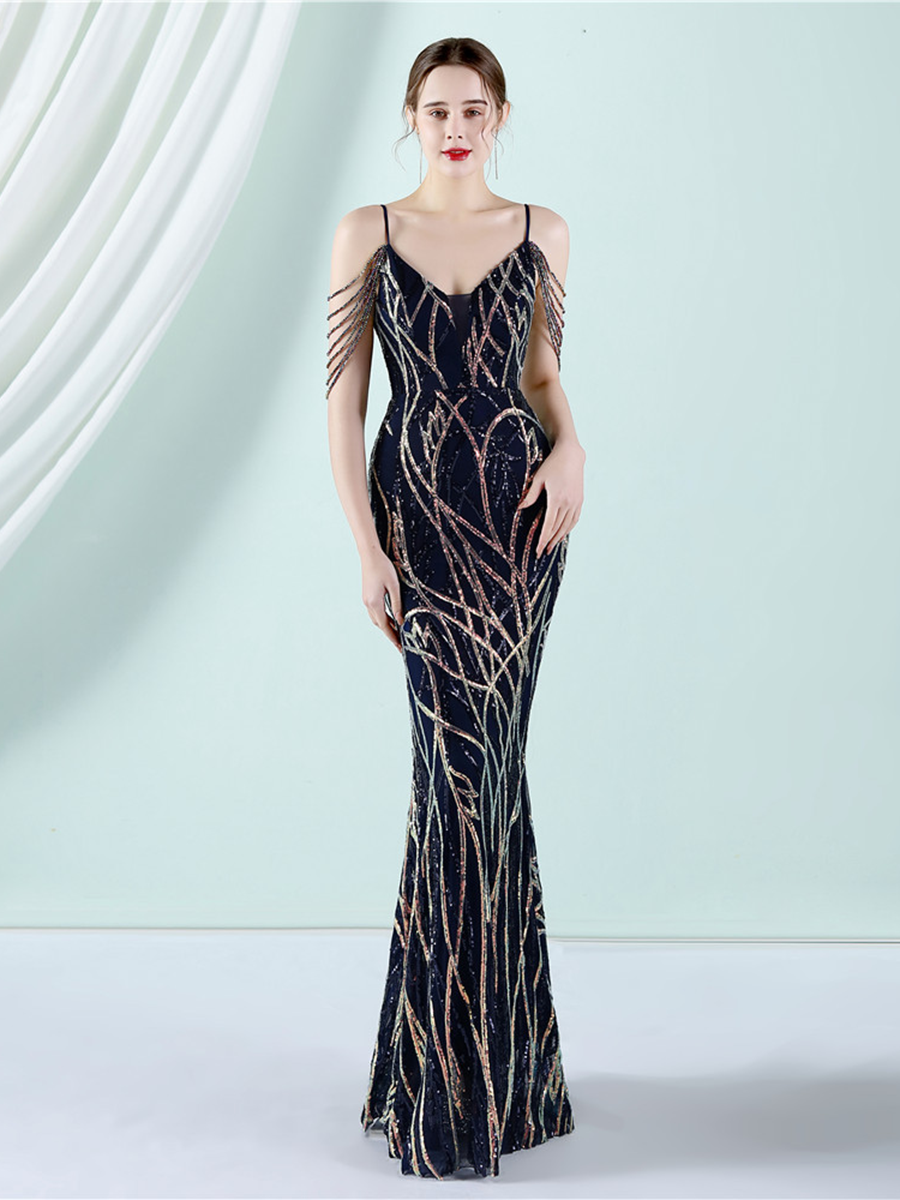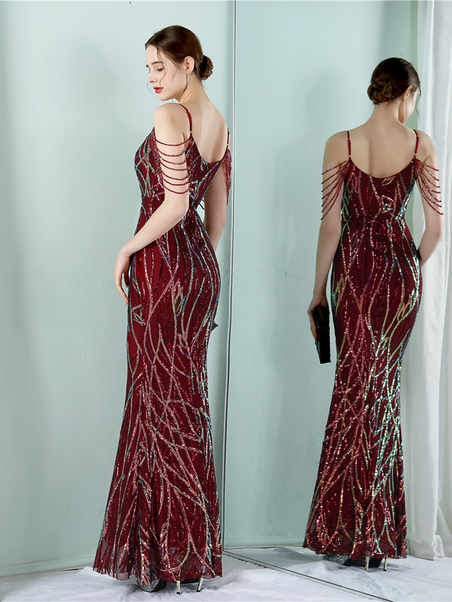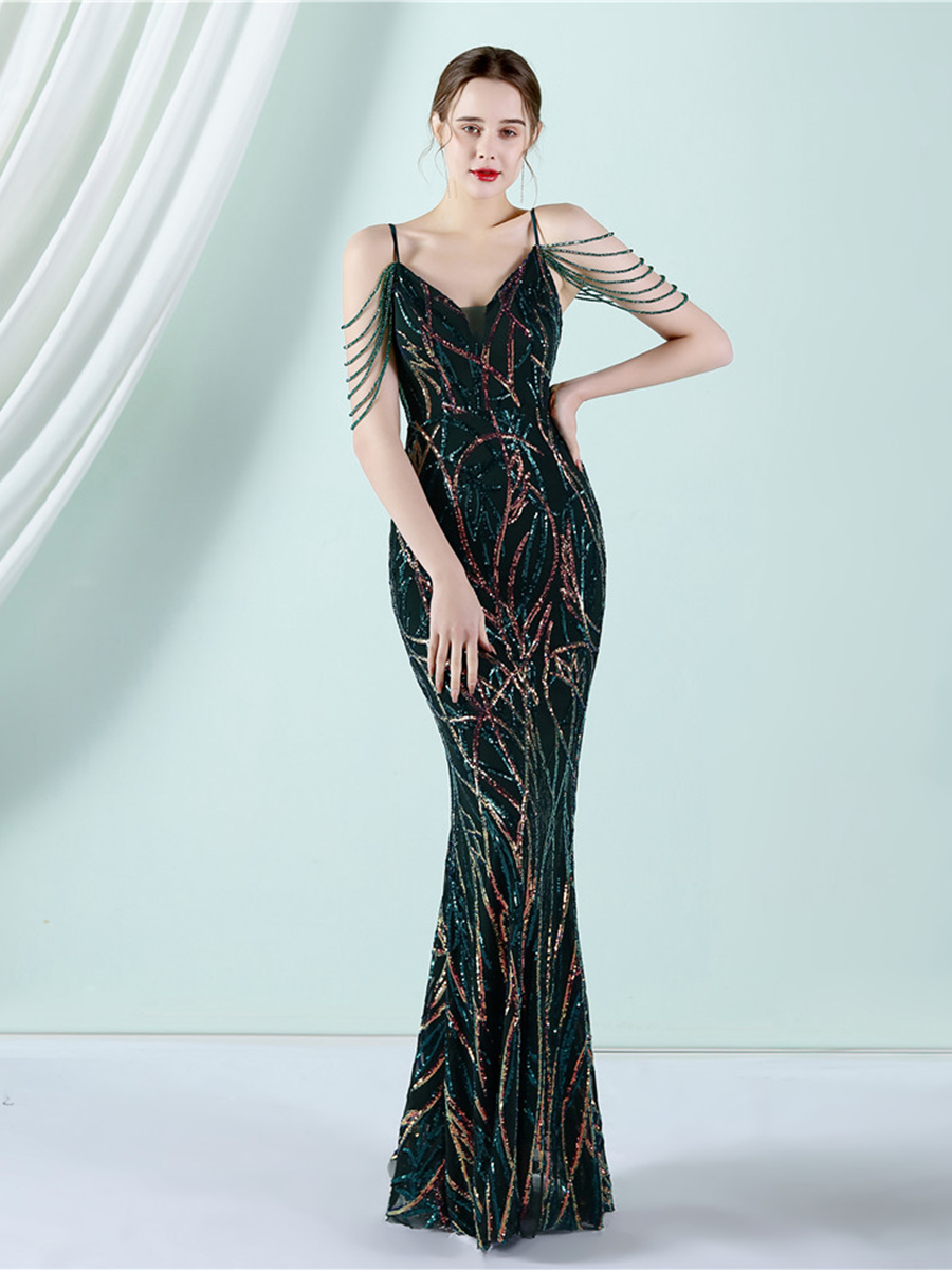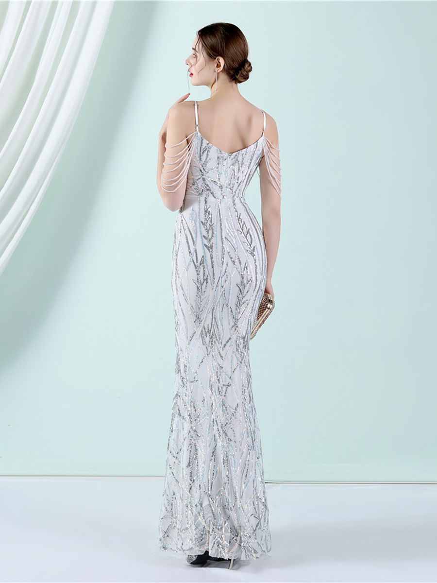 Maxi-Formalkleid mit kontrastierendem Pailletten-Netzeinsatz und Perlenkette M02088
