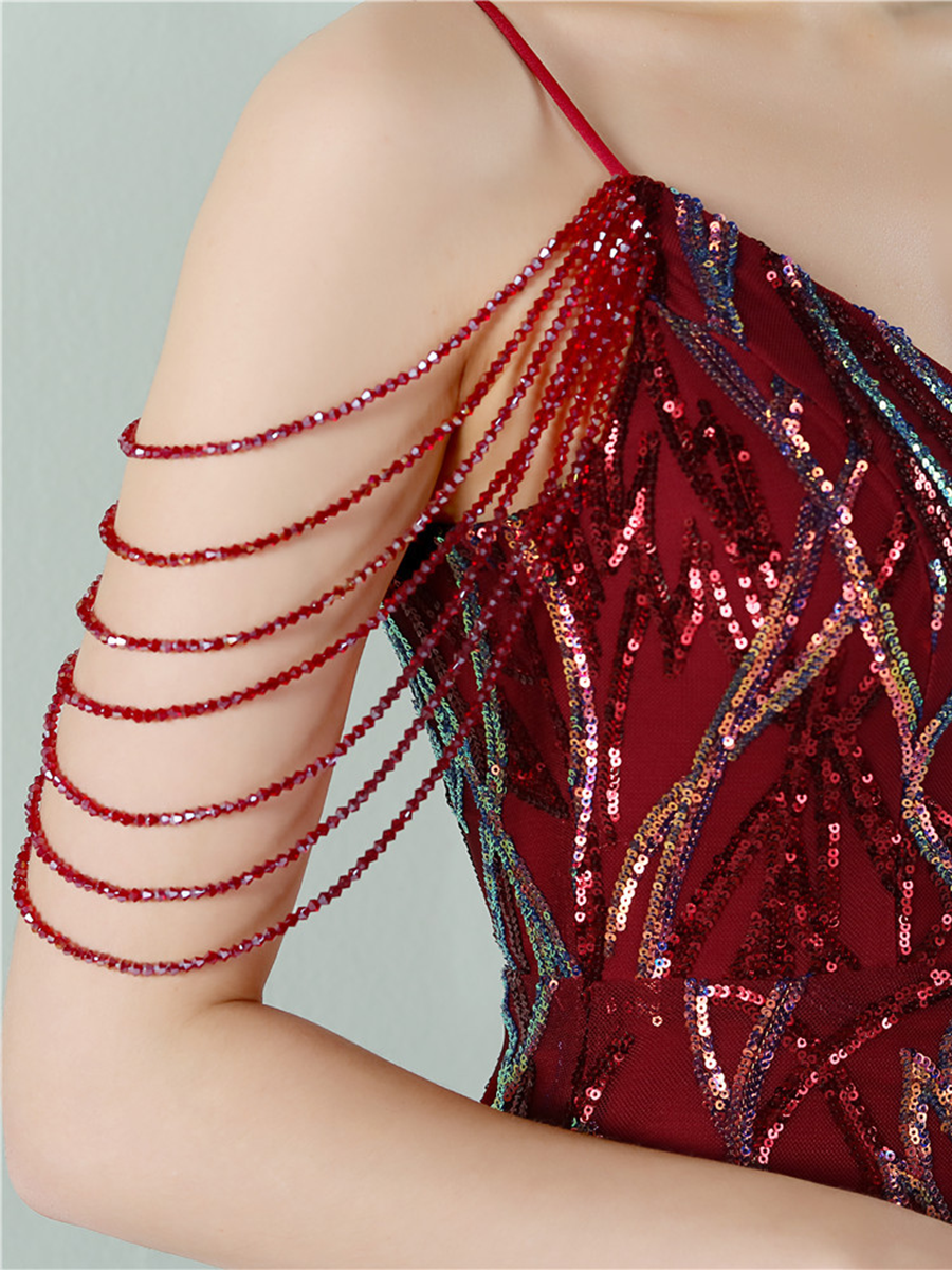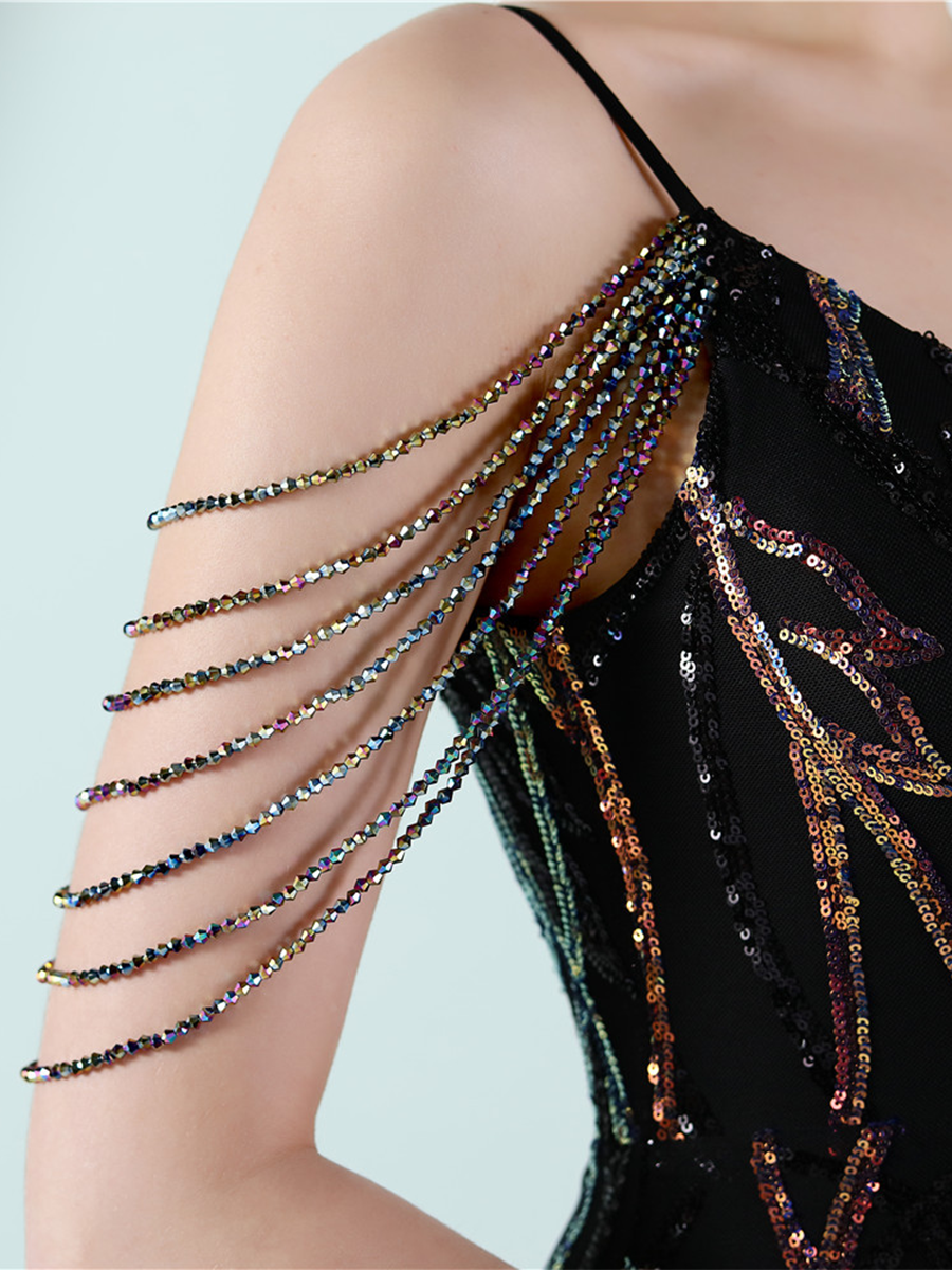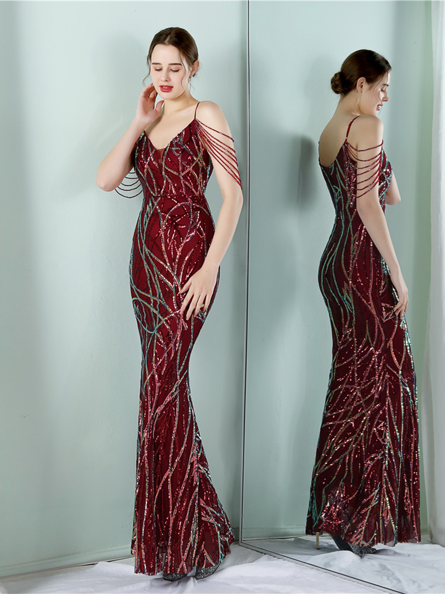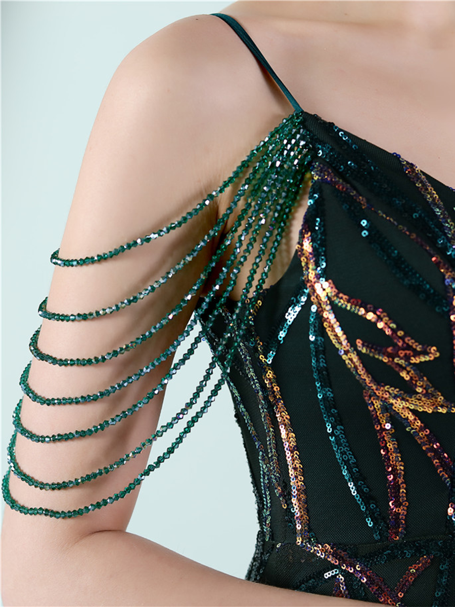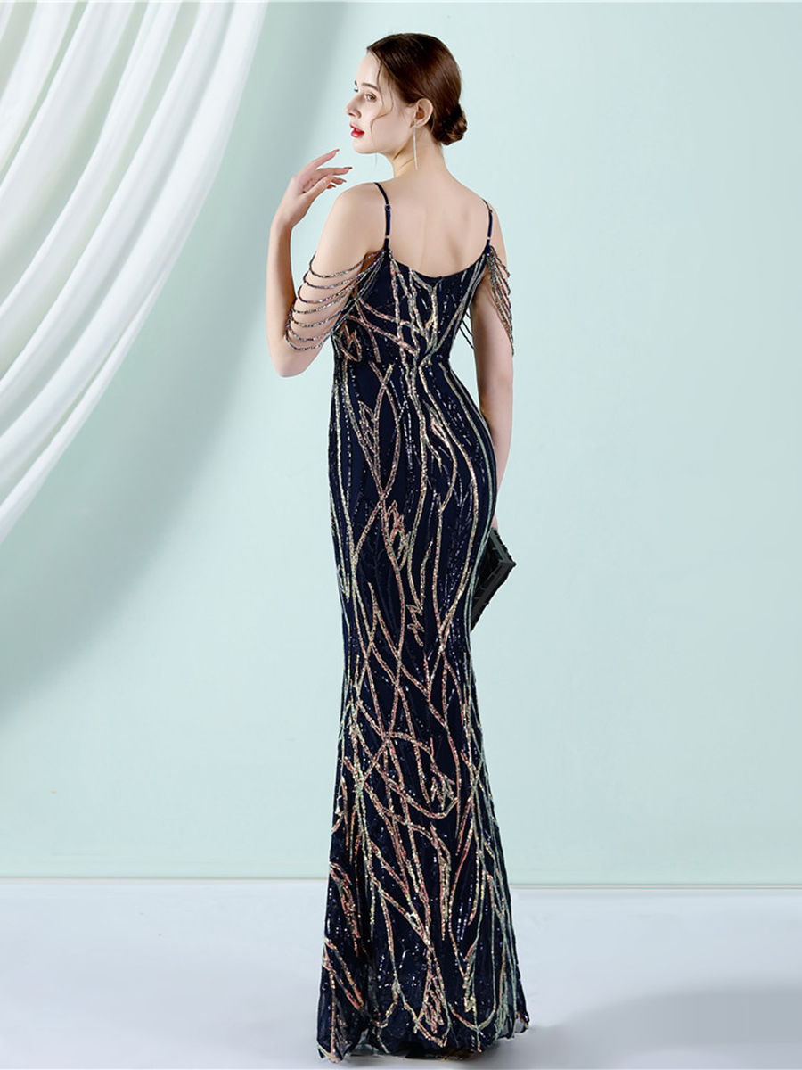 Maxi-Formalkleid mit kontrastierendem Pailletten-Netzeinsatz und Perlenkette M02088