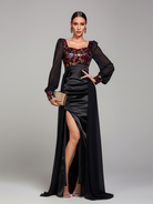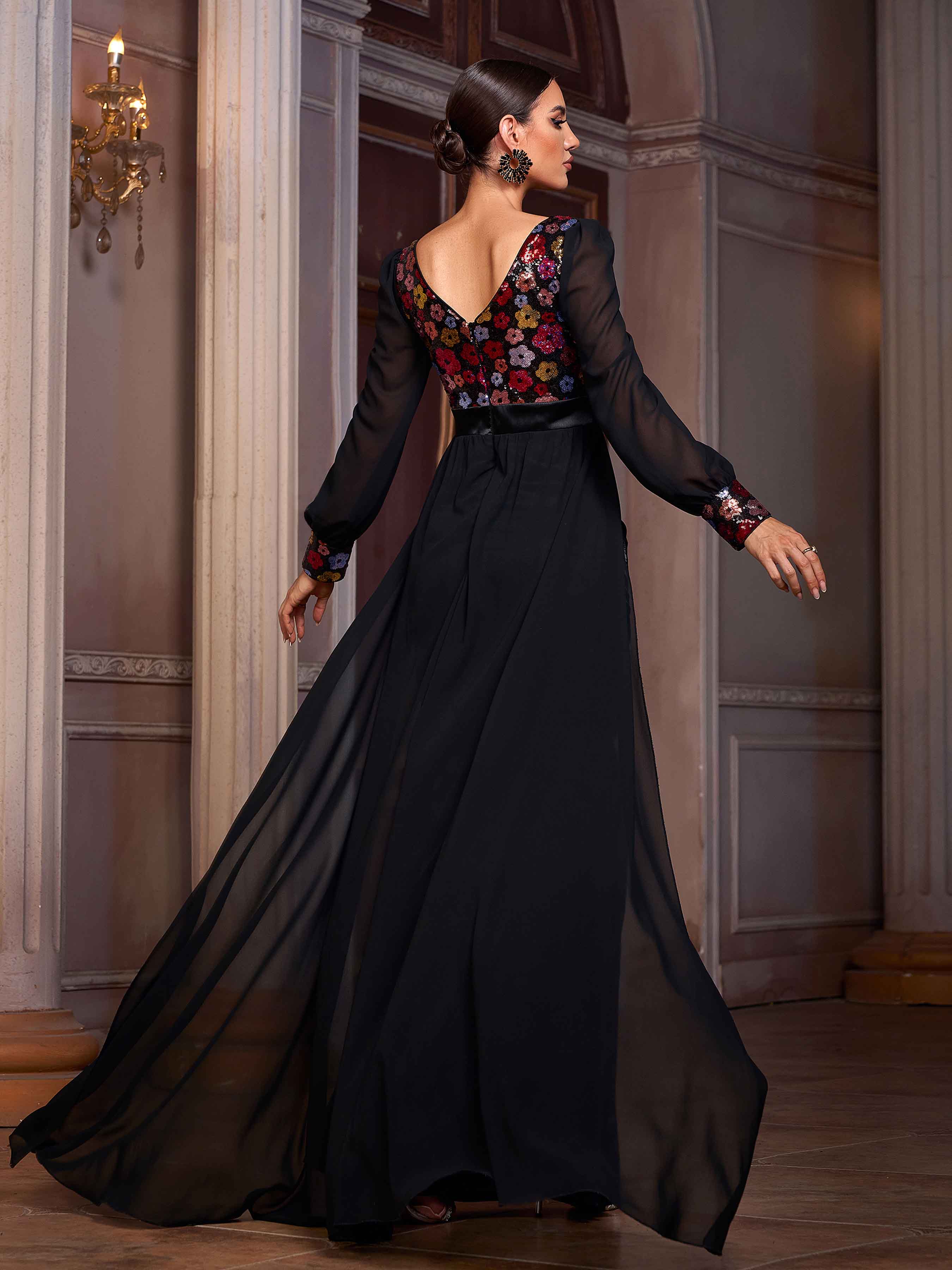 Long Sleeve Floral Sequin Draped Prom Dress SL30076