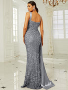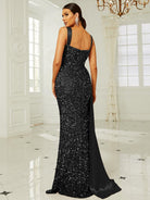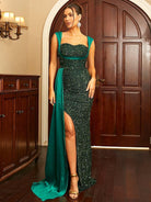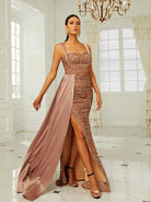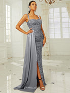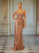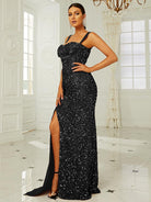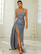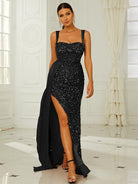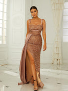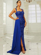 This Sleeveless Draped Maxi Sequin Prom Dress features a sweetheart neckline and spaghetti straps for a flattering and elegant look.
