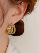Add a touch of geometric glam with these multi-layered zirconia earrings! The unique design is sure to turn heads and elevate any outfit. Shine bright with these sparkling beauties!