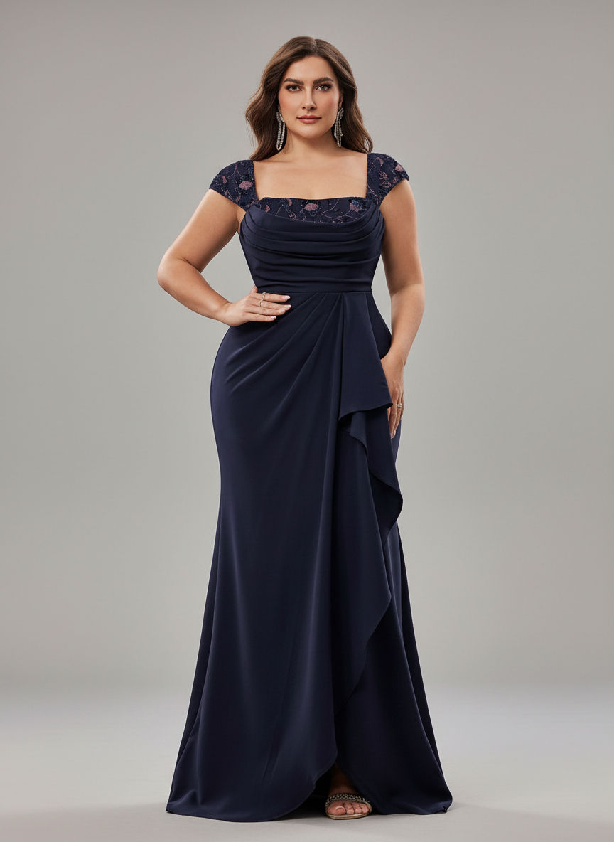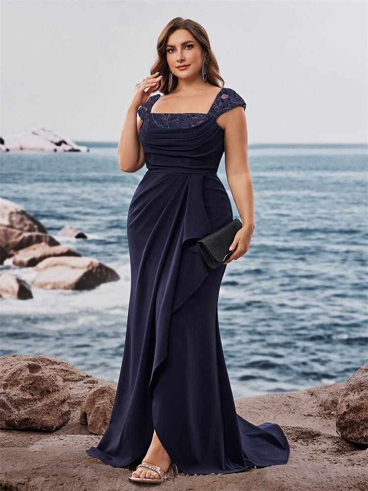 Plus Navy Blue Sequin Draped-Sleeve Formal Dress PXF25132