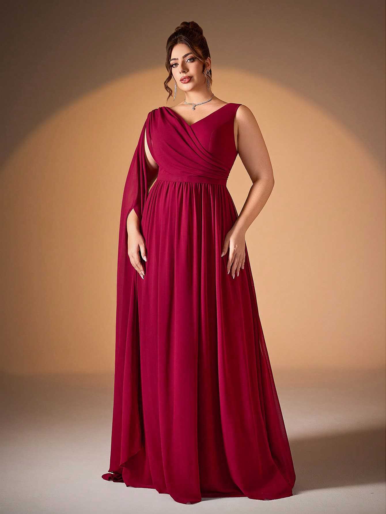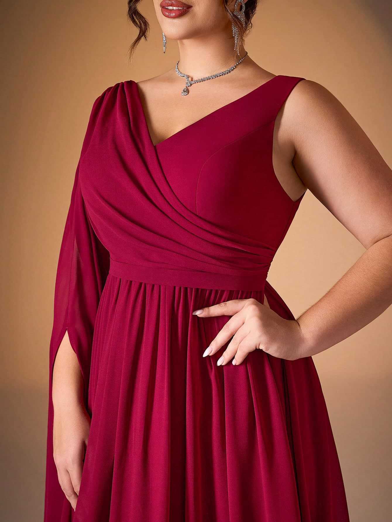 Designed for elegant formal events, this plus-size gown features a V-neckline, a dramatic draped chiffon shoulder detail, a ruched bodice, and a flowing A-line silhouette for romantic, curvy-friendly glamour. Perfect for weddings, galas, and upscale evening occasions.