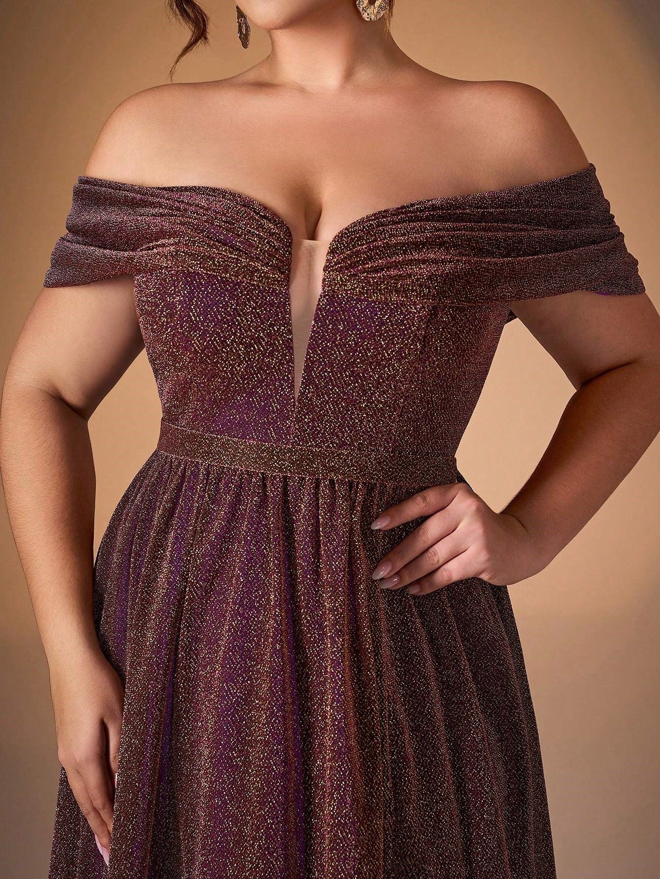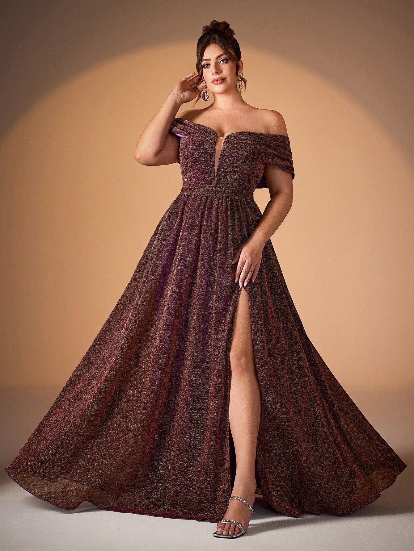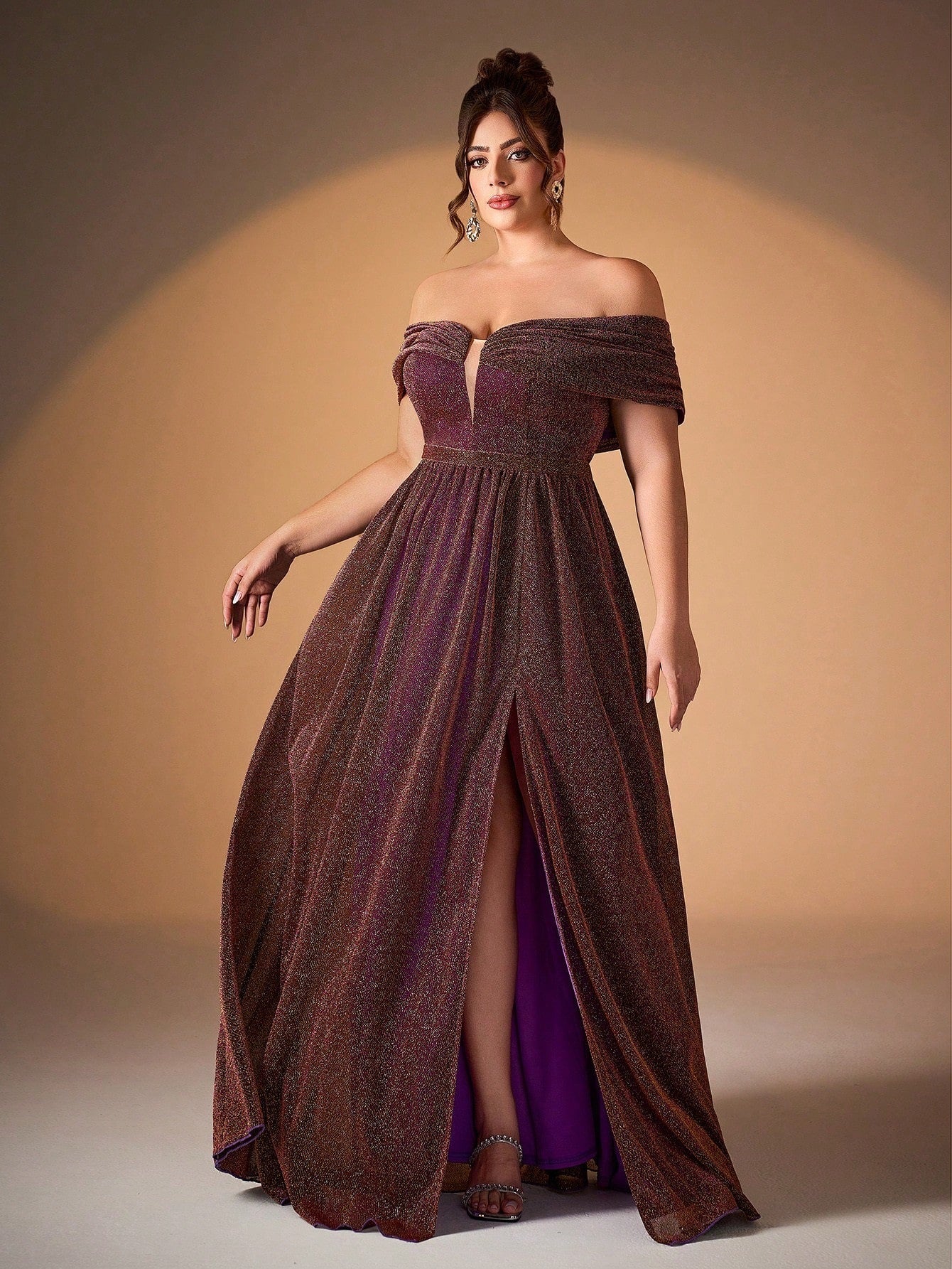 Plus Glitter Off-Shoulder A-Line Slit Evening Dress XF251301