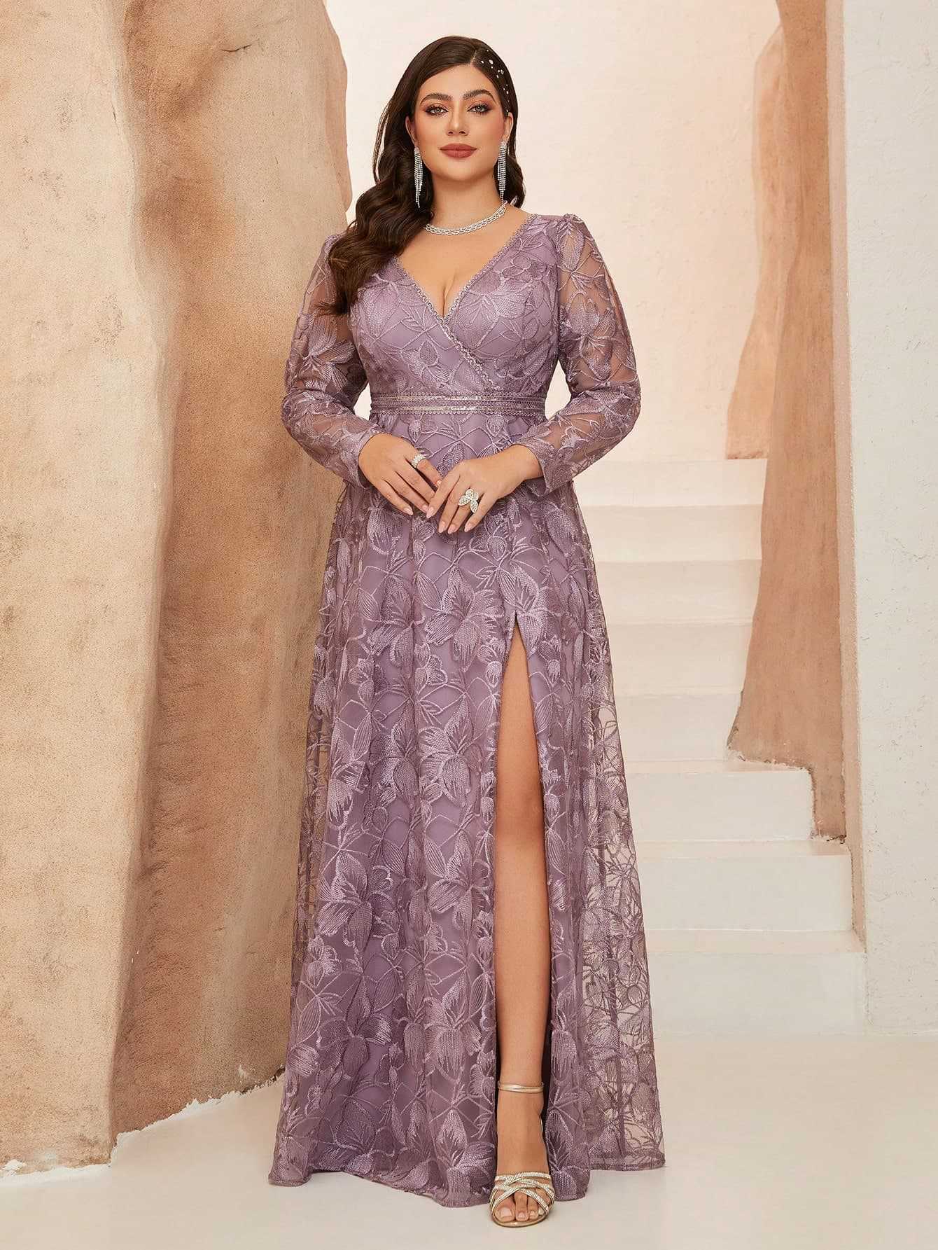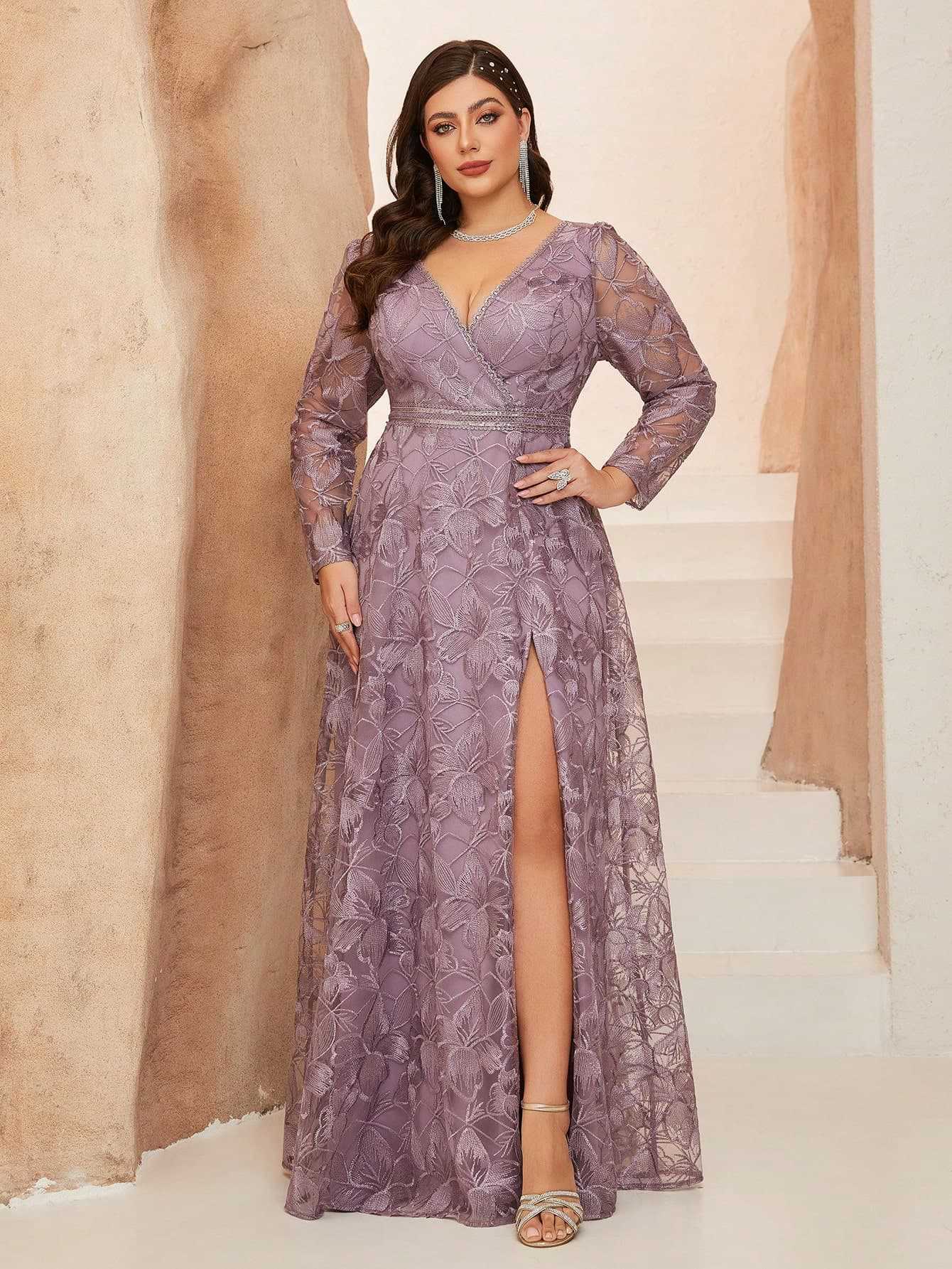 Designed for elegant formal events, this plus-size gown features a deep V-neckline, sheer long sleeves with intricate floral lace embroidery, a beaded waistband, and a flowing A-line silhouette with a high slit for romantic, curvy-friendly glamour. Perfect for weddings, galas, and upscale evening occasions.