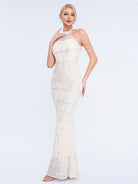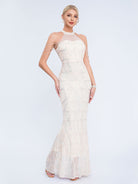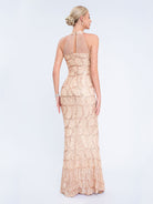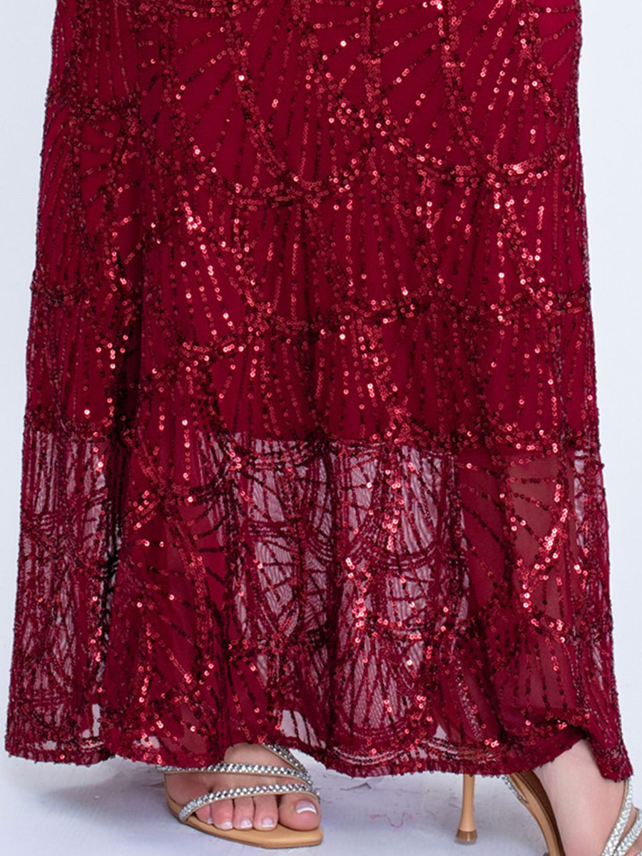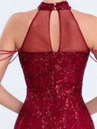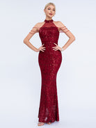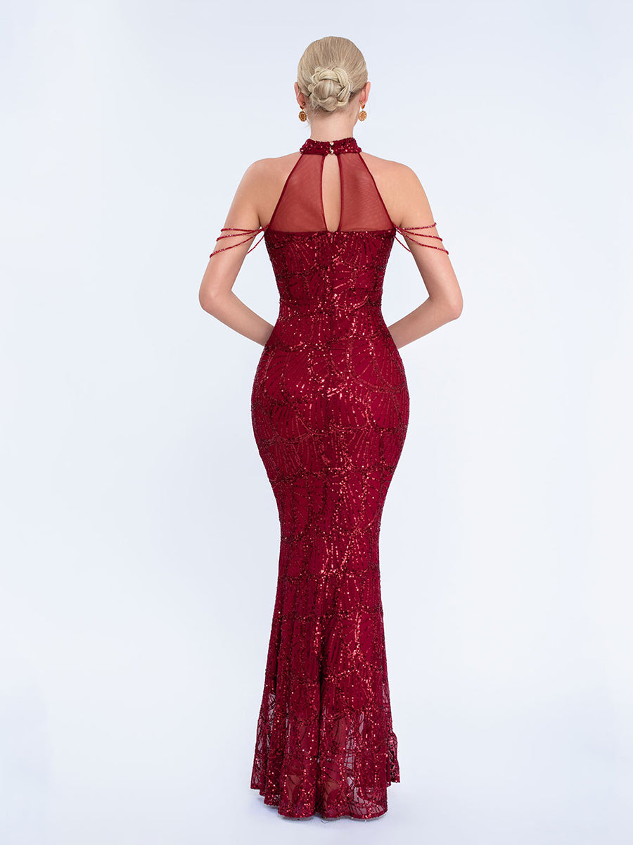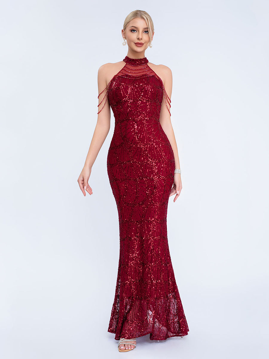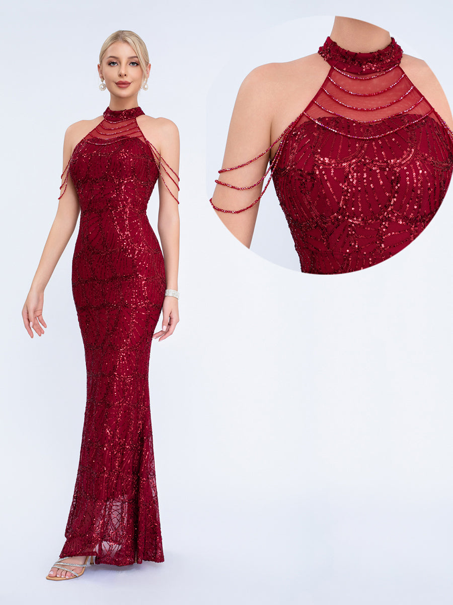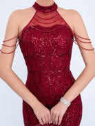 Designed for luxurious formal events, this burgundy gown features full-body sequin detailing, a halter neck with layered mesh accents, and delicate chain-style sleeve embellishments, paired with a sleek mermaid silhouette for rich, glamorous allure. Perfect for galas, upscale weddings, and elegant evening celebrations.