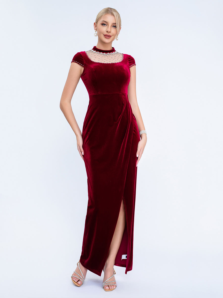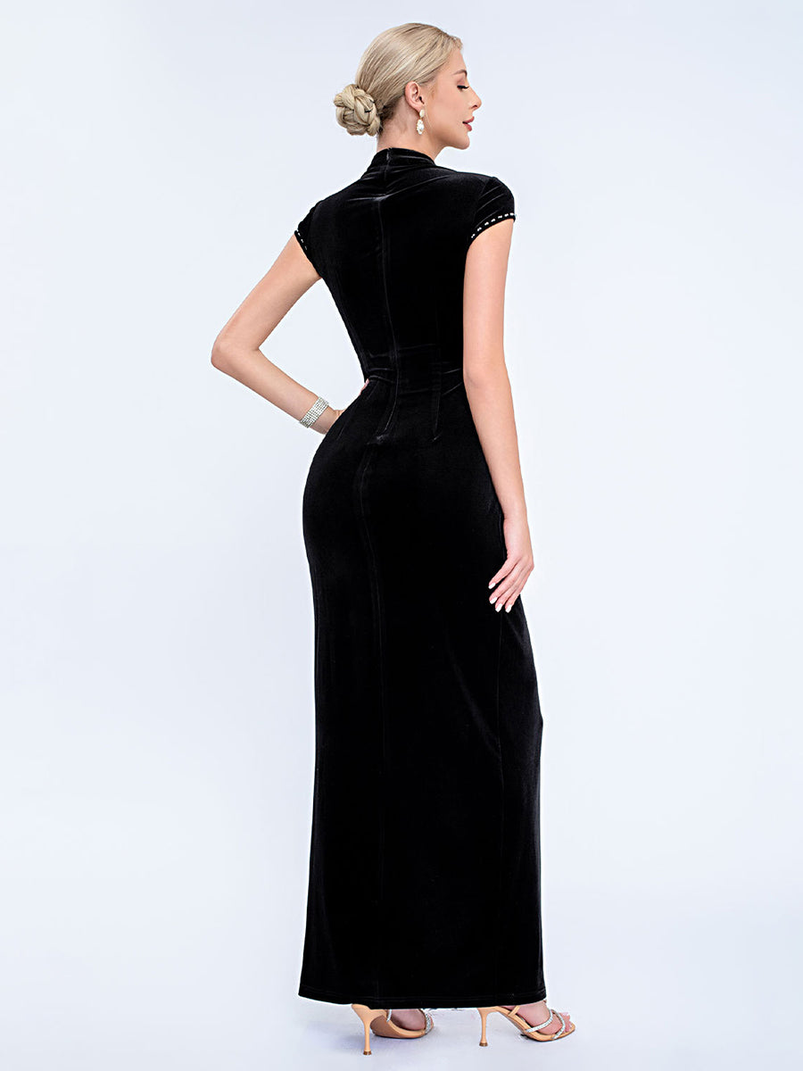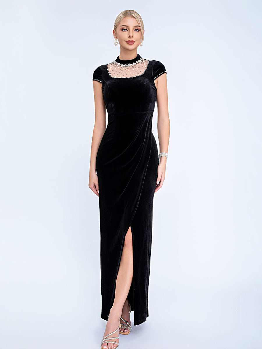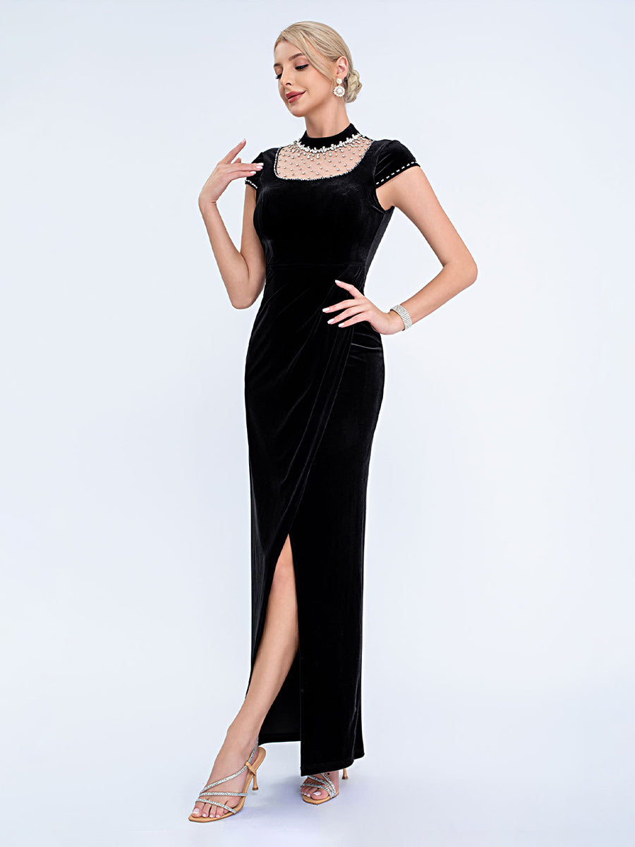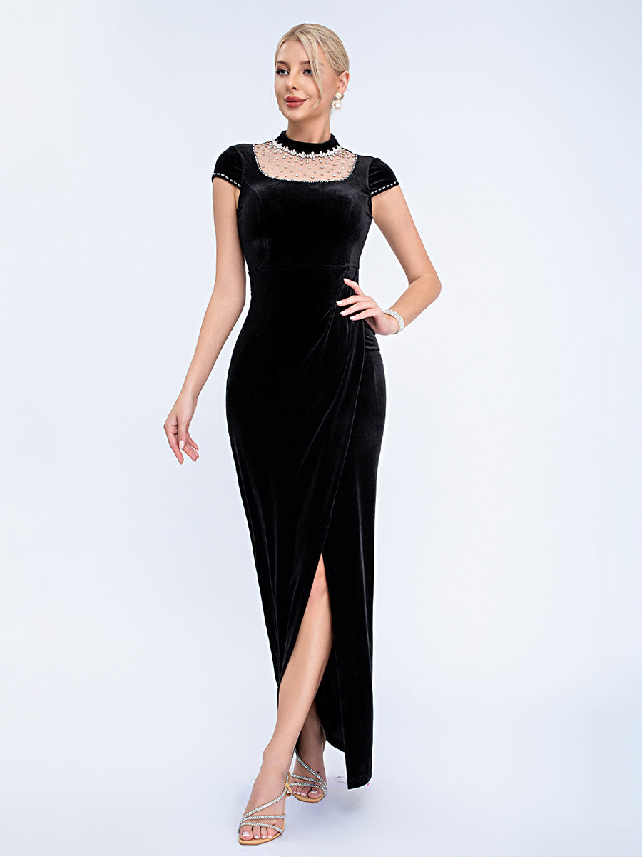 Designed for refined formal events, this black velvet gown features a pearl-adorned mesh high neck, short capped sleeves, a sleek fitted silhouette, and a high slit for timeless, sophisticated charm. Perfect for cocktail parties, upscale dinners, and semi-formal evening occasions.