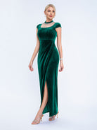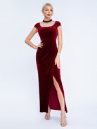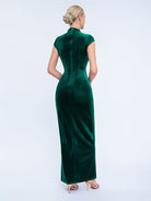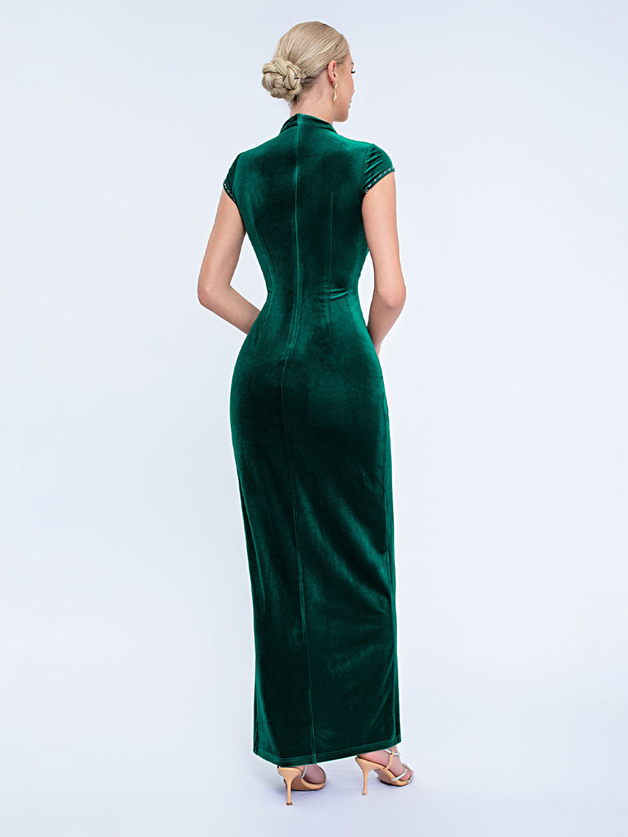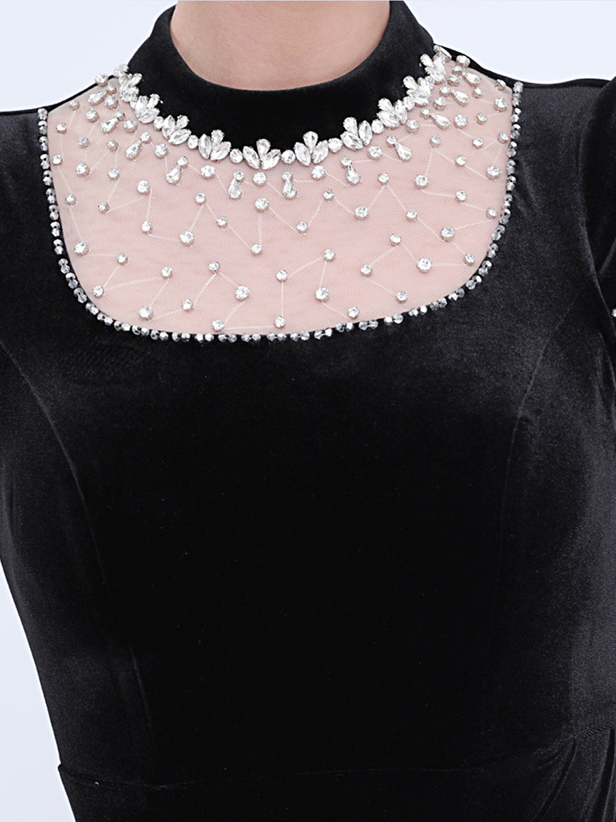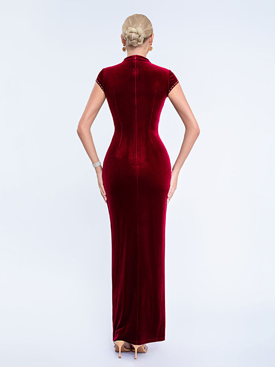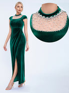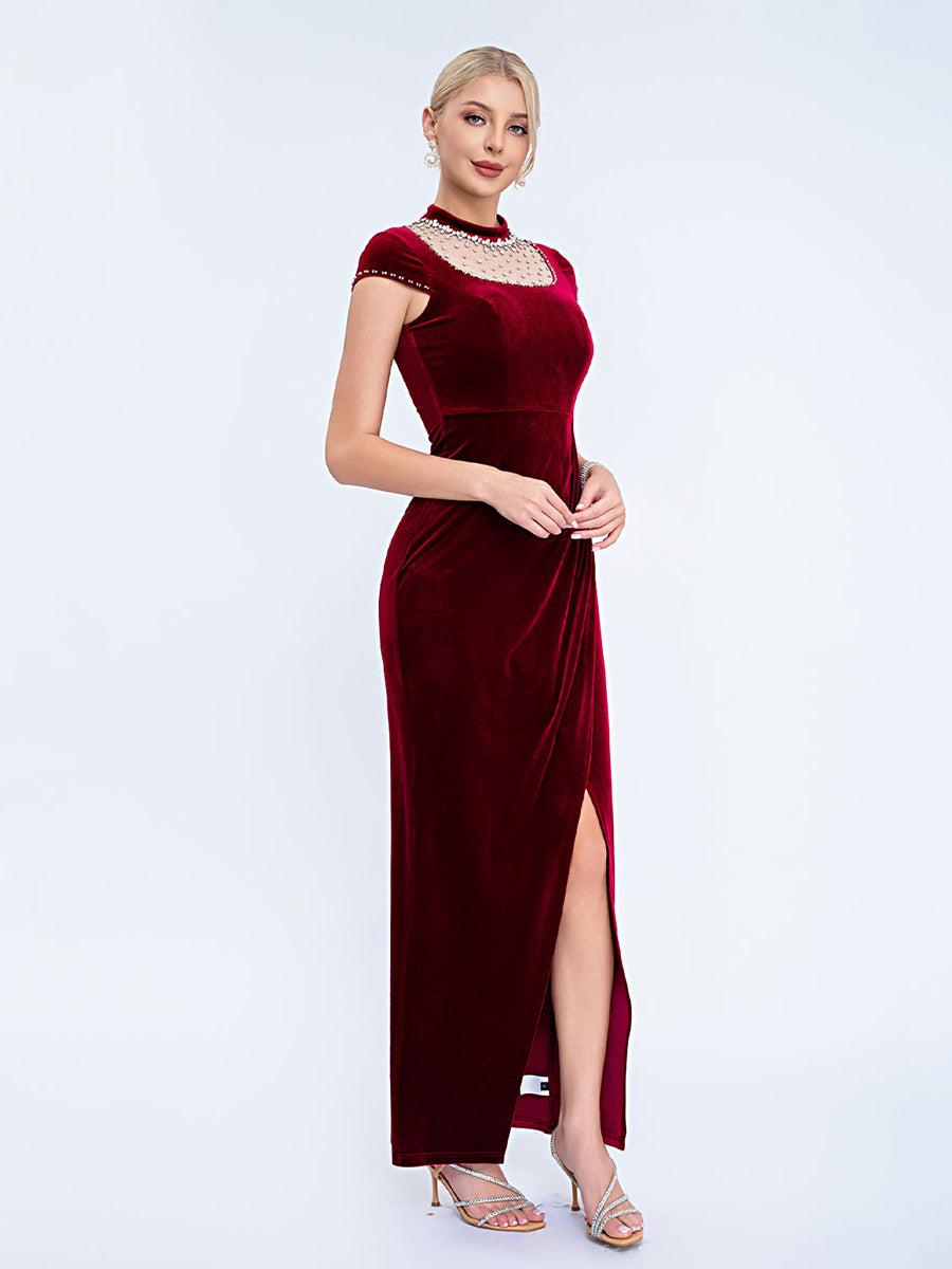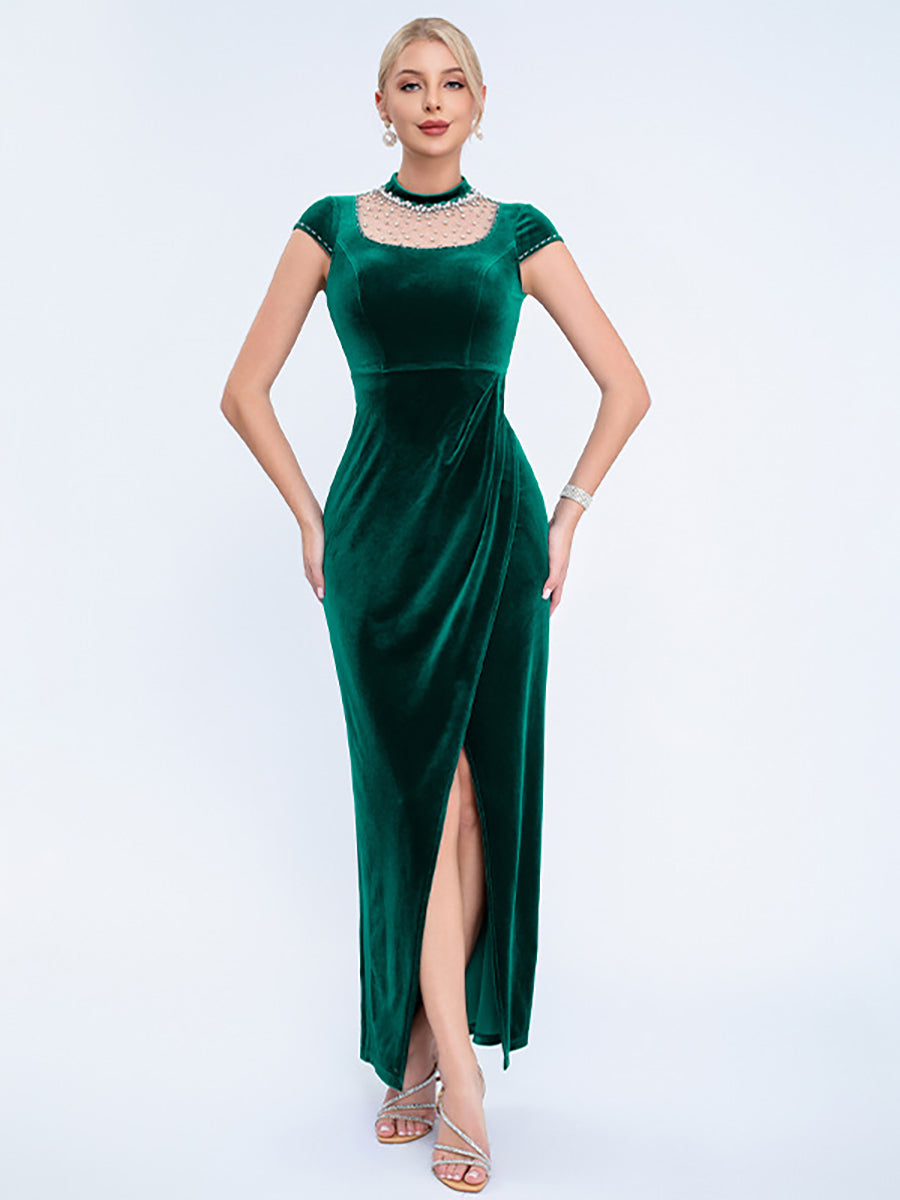 Designed for refined formal events, this black velvet gown features a pearl-adorned mesh high neck, short capped sleeves, a sleek fitted silhouette, and a high slit for timeless, sophisticated charm. Perfect for cocktail parties, upscale dinners, and semi-formal evening occasions.