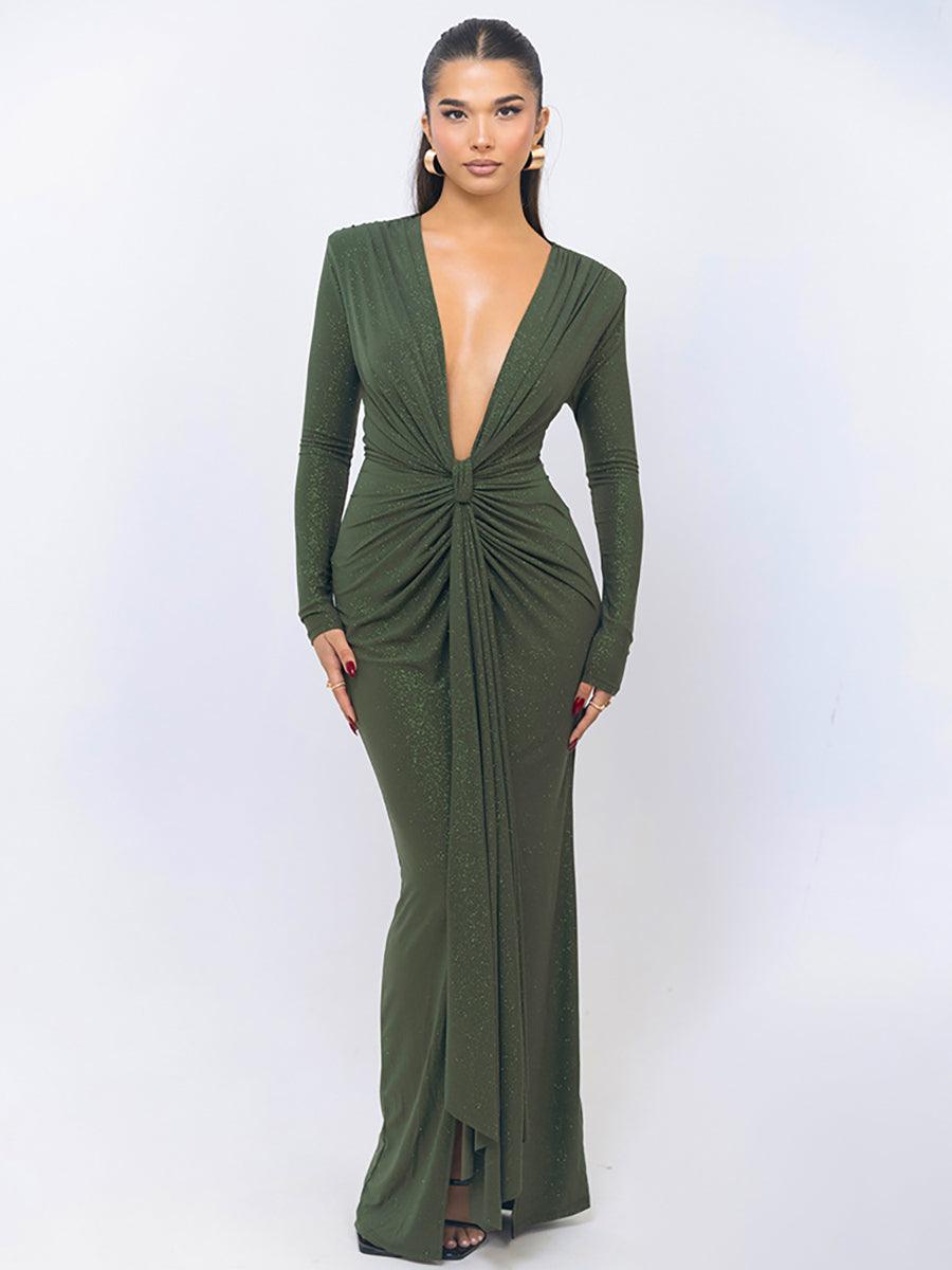 Plung Long Sleeve Ruched Solid Prom Dress MYC2022